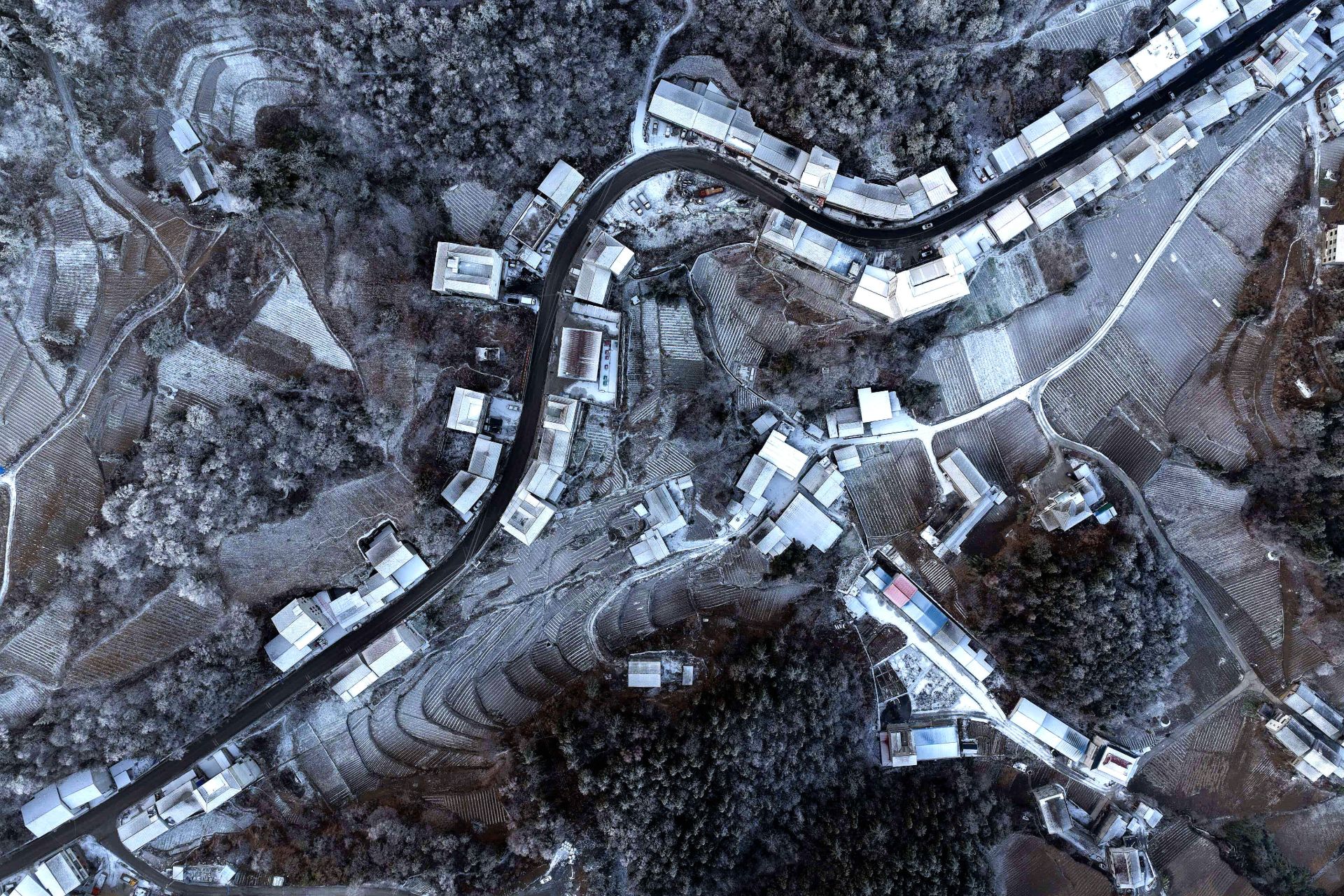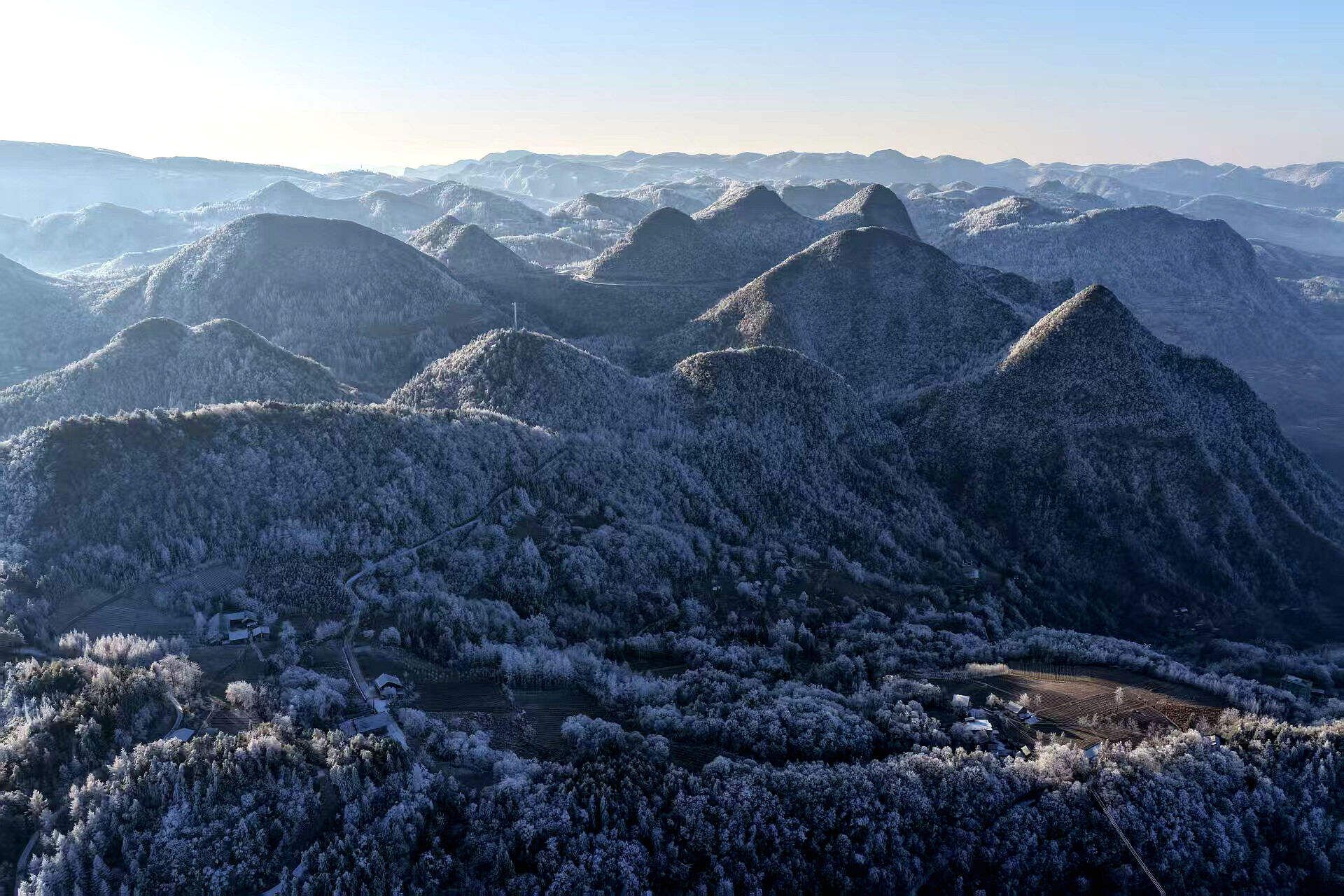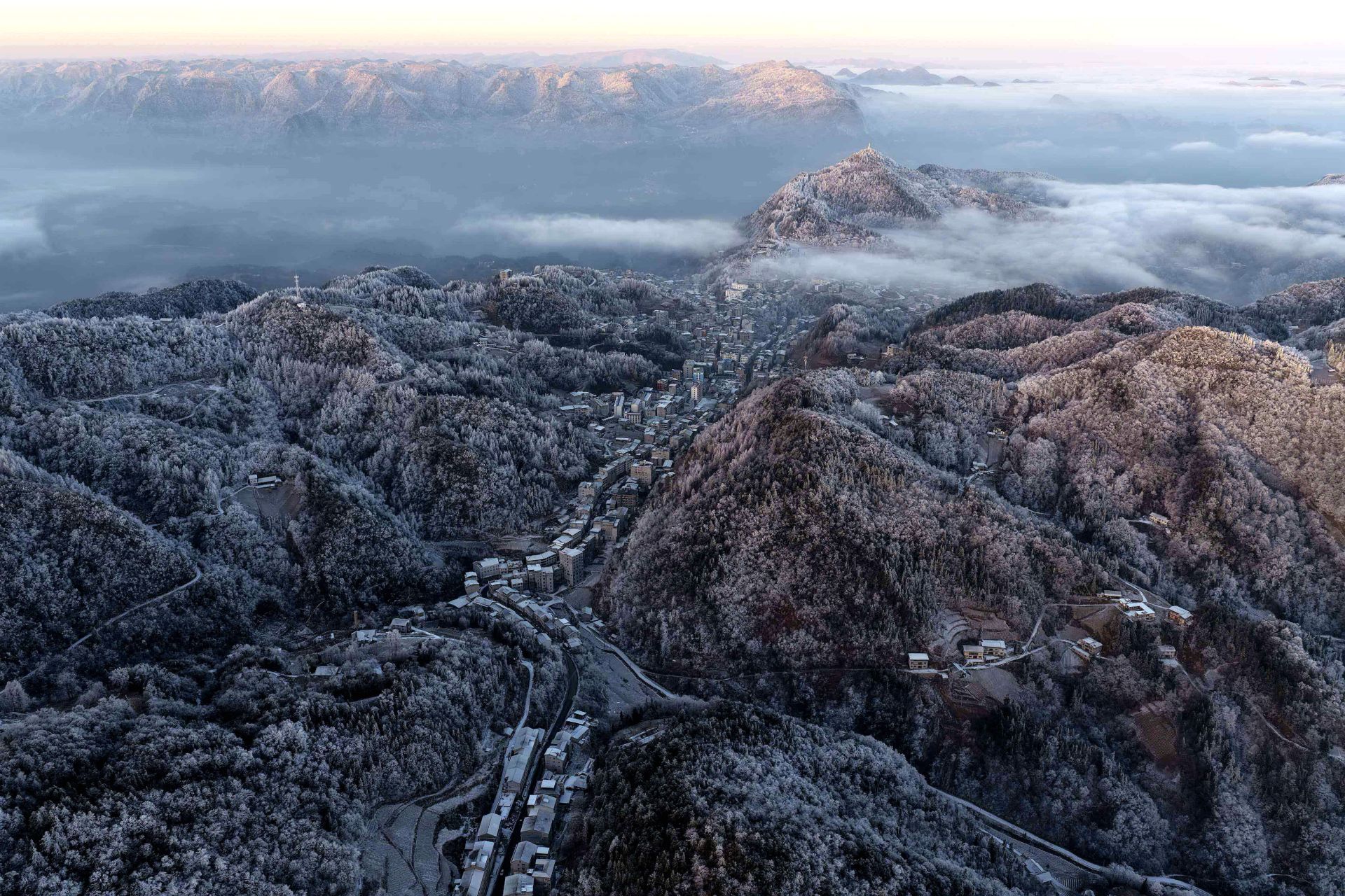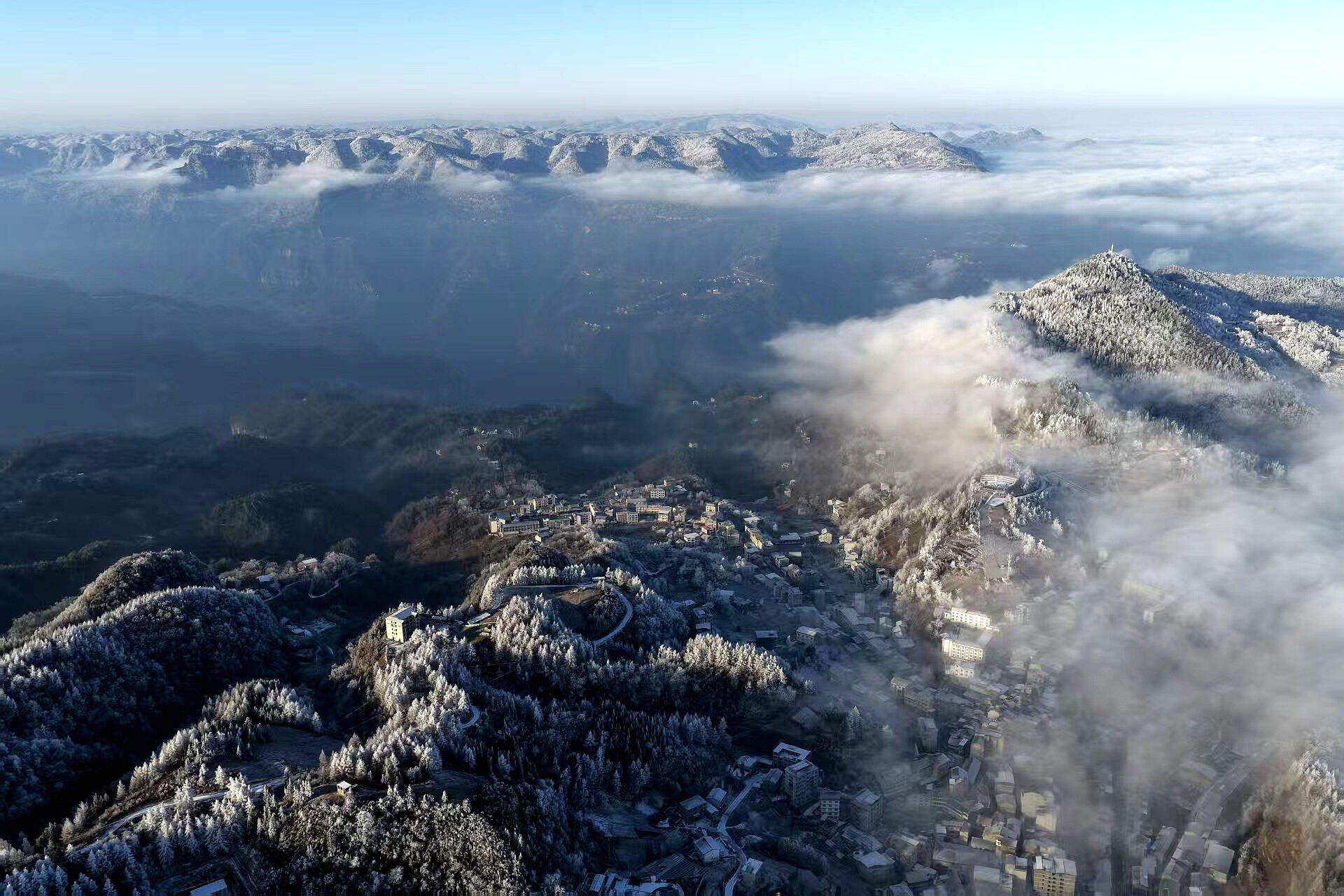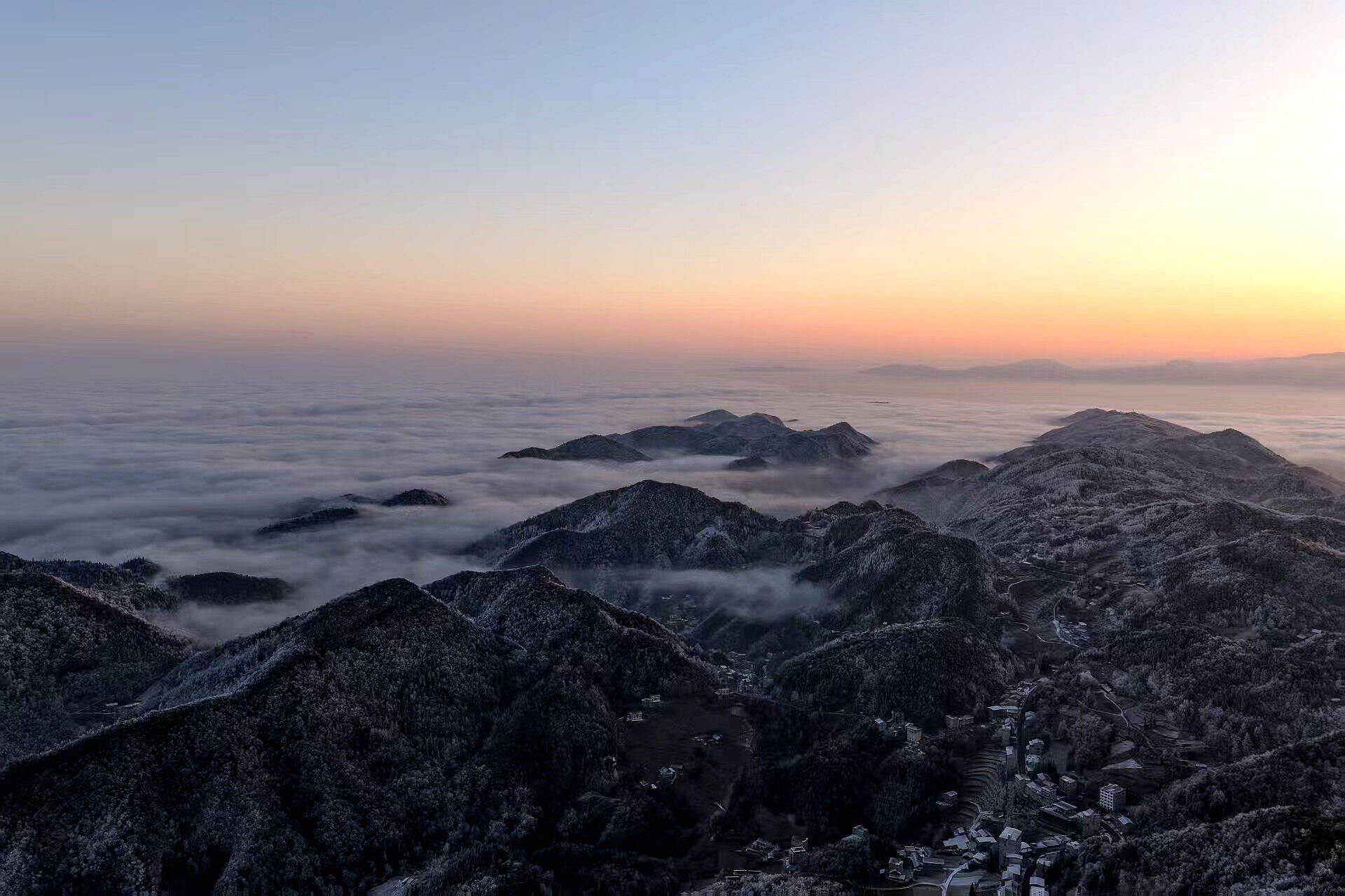 山峦黛影隐约浮于云上,积雪的树枝折射细碎银光,宛如一幅水墨长卷。静谧村落白墙黛瓦点缀其间,与辽阔云海、连绵雪岭共同勾勒出独特的冬日乡村画卷。