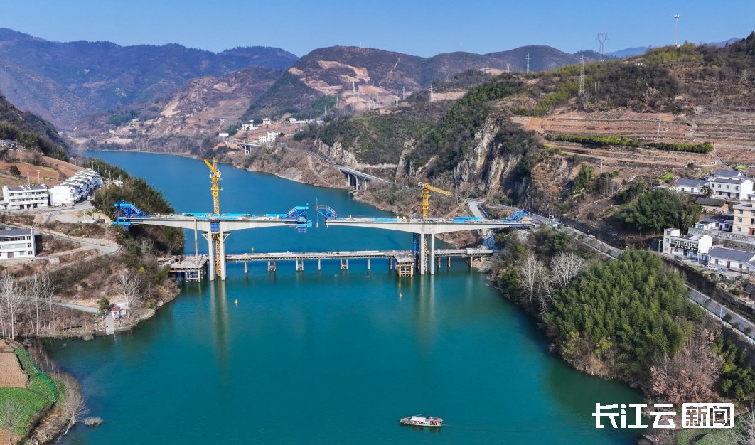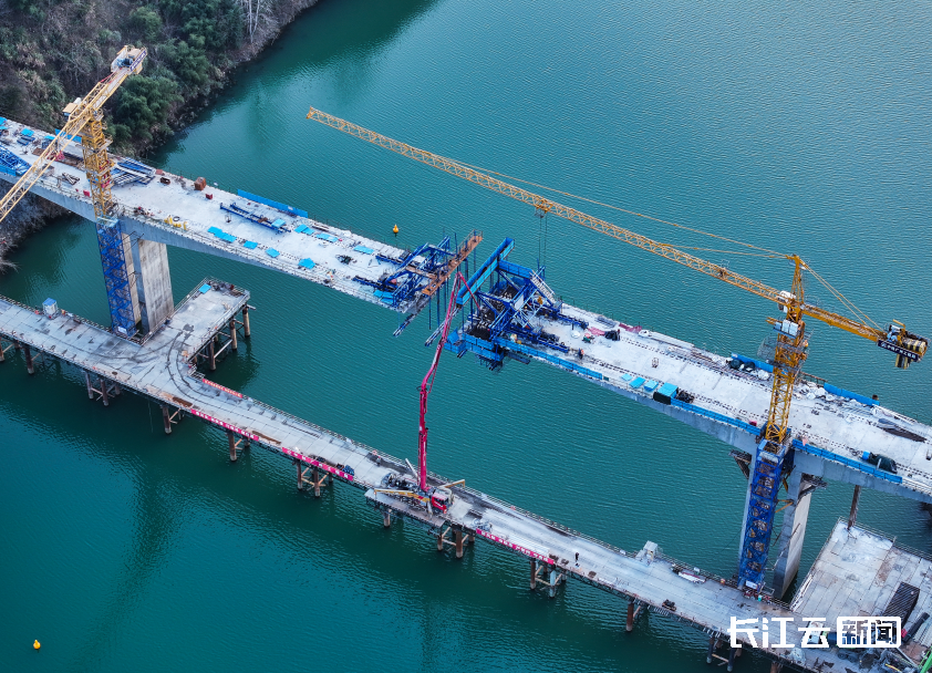 1月26日,湖北省竹山县钦峪堵河大桥雄姿初现,现场挂篮悬臂浇筑作业有序推进,施工已完成80%,主体即将合龙,预计2026年五一前可竣工通车。