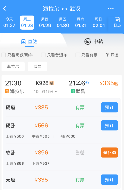 武昌站开通直达海拉尔列车,全程48小时,票价335元起