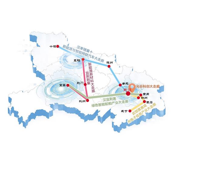 以东湖科学城为核心区域的光谷科创大走廊成势见效,“汉孝随襄十”新能源与智能网联汽车、“武鄂黄黄咸”光电子信息、“宜荆荆襄”新能源新材料、“汉宜荆黄”绿色智能船舶等产业走廊加快建设。
