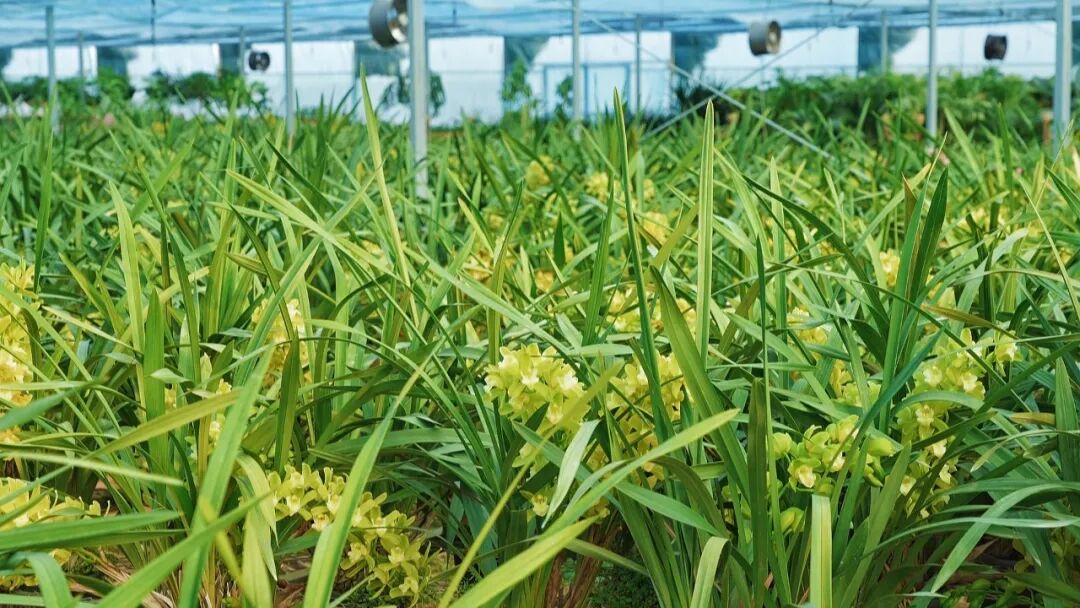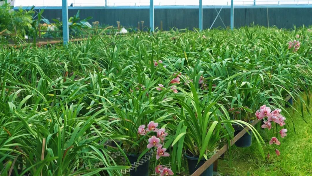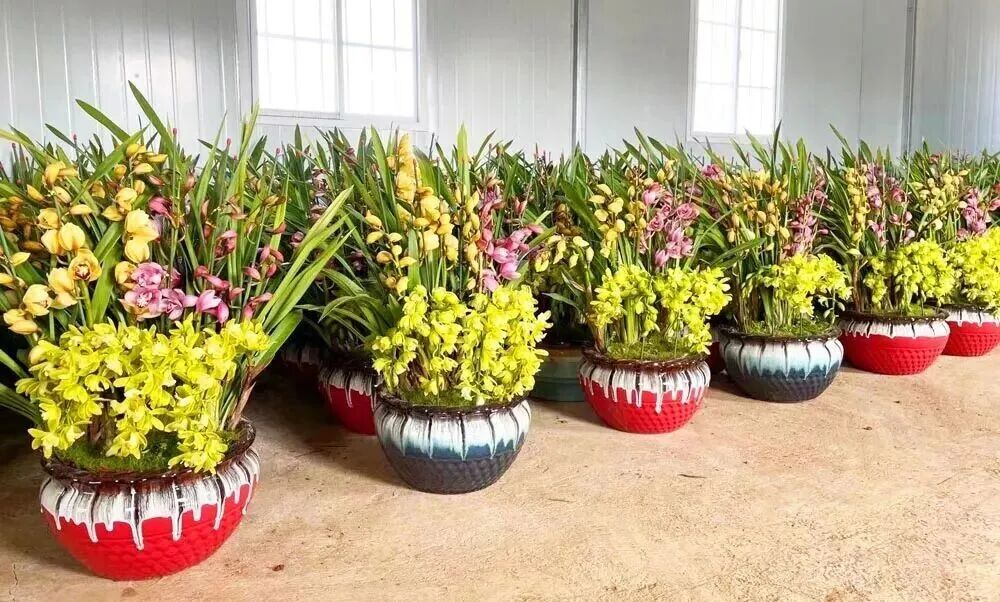 据悉,该基地面积100多亩,主要培育大花蕙兰、栀子花、绣球花等品种。其中,大花蕙兰存量超10万盆,是基地的主打产品。其因花型雍容、色泽明丽、寓意富贵吉祥,且花期较长,历来是年宵花市场上的热门选择。