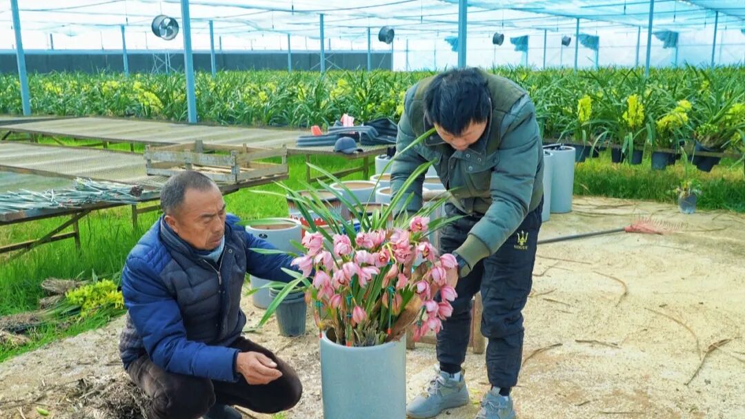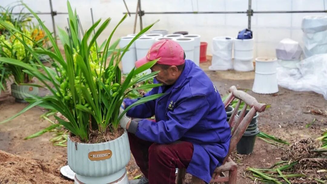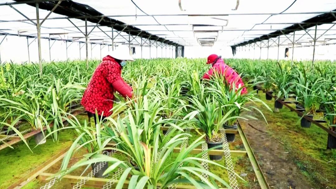 在周巷镇骆店村的大花蕙兰种植基地,连片的温室大棚内温暖如春。一盆盆大花蕙兰整齐排列,金黄、艳红、粉白等各色花朵绚丽绽放,生机盎然。工人们正熟练地进行修整枝叶、塑形固定、打包发货,现场一片繁忙景象。