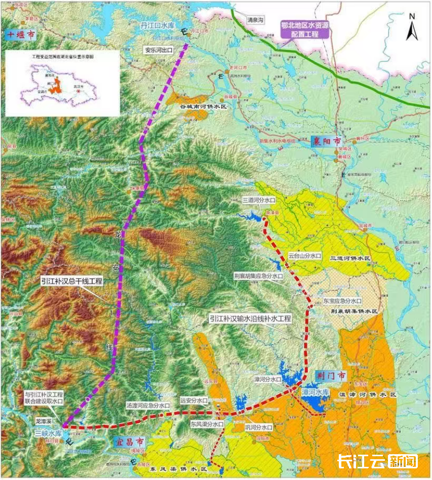 作为南水北调后续重要组成和湖北“荆楚安澜”现代水网核心项目,引江补汉输水沿线补水工程将和目前在建的引江补汉工程并排设置取水口。引江补汉工程作为“国家水网大动脉”,以年调水39亿立方米满足汉江中下游流域用水需求;沿线补水工程则化身“区域毛细血管”,重点破解汉江右岸缺水困境。