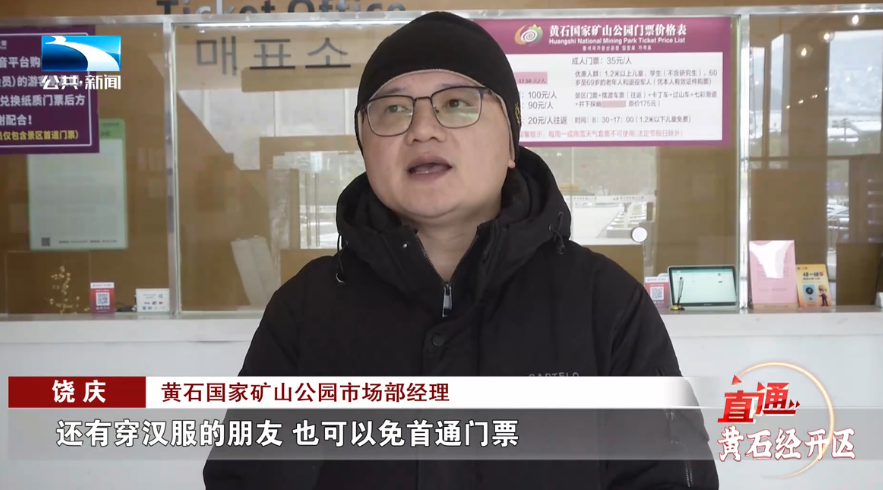 黄石国家矿山公园市场部经理 饶庆:到时候我们在前台,我们售票窗口这边领取五铢钱,然后可以抵我们的二消项目。我们每个下井的井下探幽的游客,也可以得到我们的一块矿晶。春节的话,姓马的还有姓冯的,只要有带马字的,我们可以免首通门票;还有cosplay,还有穿汉服的朋友,也可以免首通门票。