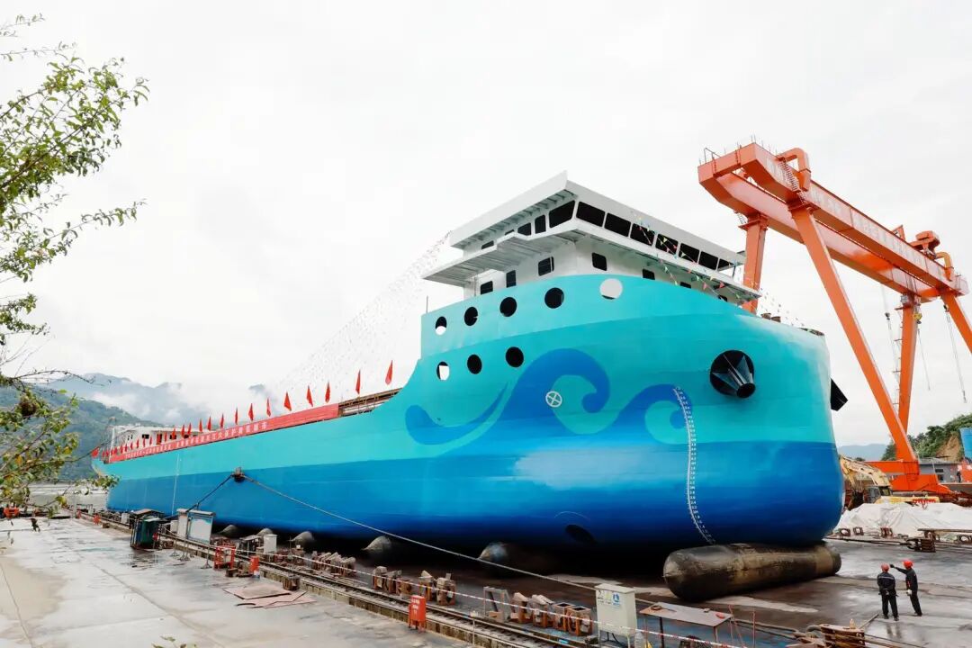 ▲全球最大的纯电动散货船日前在秭归县华星船厂成功下水。黄翔 摄