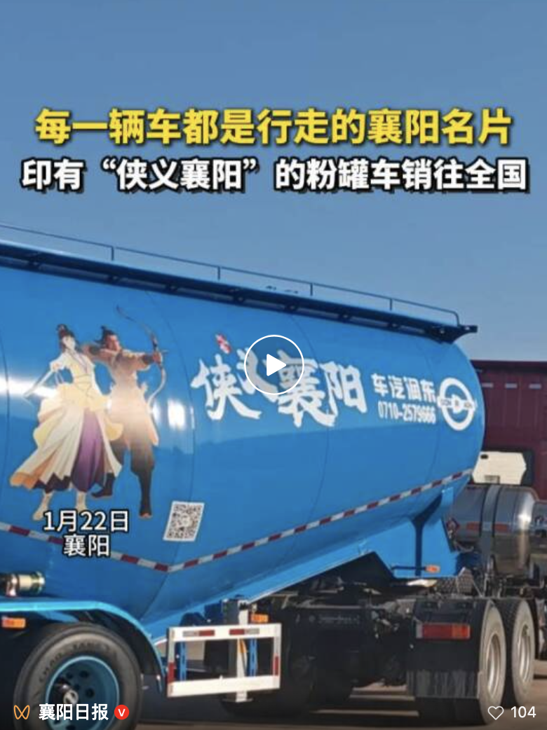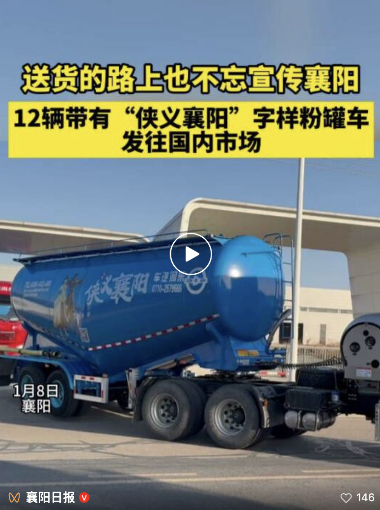 1月22日,记者来到湖北东润汽车有限公司,只见一排喷涂着“侠义襄阳”标识的粉罐车整齐列阵,蓄势待发。该公司华南区域销售经理高良波介绍说:“去年年底,广东的客户一次性订购了30台带有‘侠义襄阳’标识的粉罐车,眼前这15台是第二批即将交付的。”他表示,今年“侠义襄阳”成为火爆全网,车辆销往全国的同时,也把襄阳的侠义精神传递到四面八方。“车开到哪里,襄阳的名片就带到哪里。”