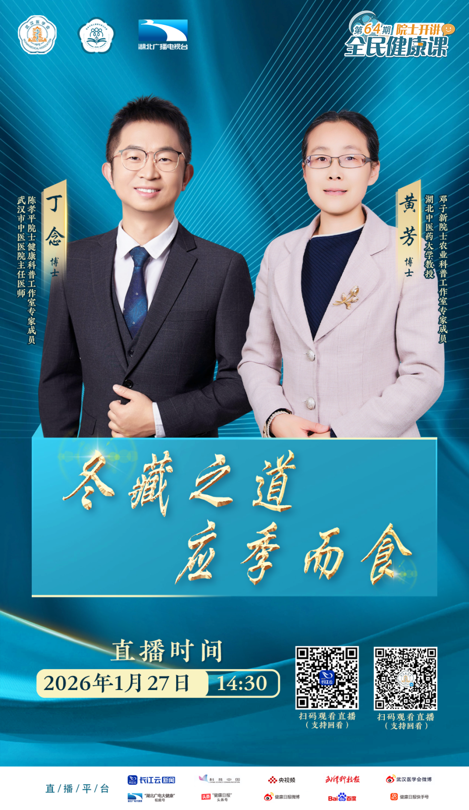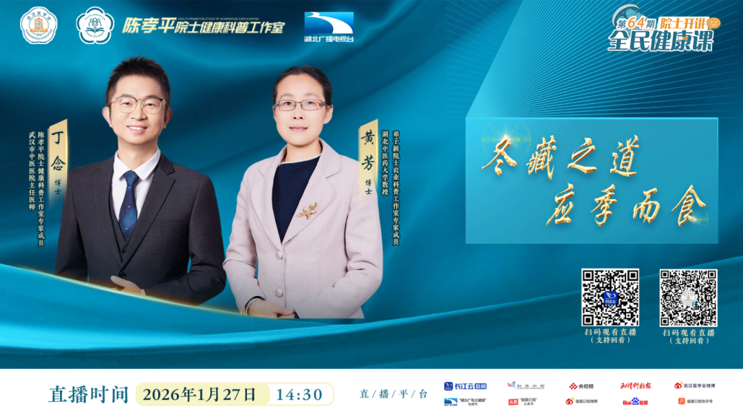 本期陈孝平院士健康科普工作室主办的《院士开讲:全民健康课》特邀中医专家——陈孝平院士健康科普工作室专家成员、武汉市中医医院主任医师 丁念 与膳食专家——邓子新院士农业科普工作室专家成员、湖北中医药大学教授 黄芳 跨界对话,陈孝平院士健康科普工作室和邓子新院士农业科普工作室首次联袂合作,跨界为大家解锁“冬藏”养生密码。