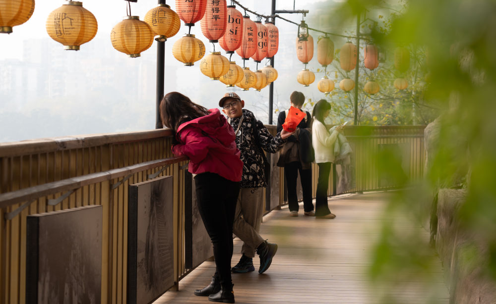 2026年1月18日,游客在山城巷临崖步道上拍照打卡。新华社记者 李爱斌 摄