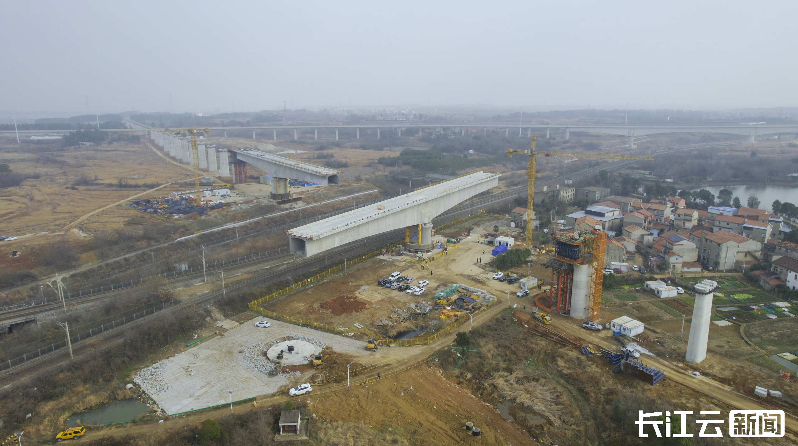 塘埠口滠水特大桥连续梁是合武高铁湖北段的“咽喉”工程,本次实施转体的400号连续梁体长133米、宽12.6米,体量庞大。“这个重量相当于约9200辆普通家用轿车同时悬在半空,且施工环境极为敏感。”项目总工程师李玉涛介绍道,作为全线施工环境最为复杂的工点之一,该梁体处于繁忙的铁路枢纽地段,需同时跨越京广货铁路货线上行线及麻武铁路上下行线三条干线,由于施工区域紧邻既有铁路接触网高压线,作业空间呈“立体压缩”状态,安全风险极高。