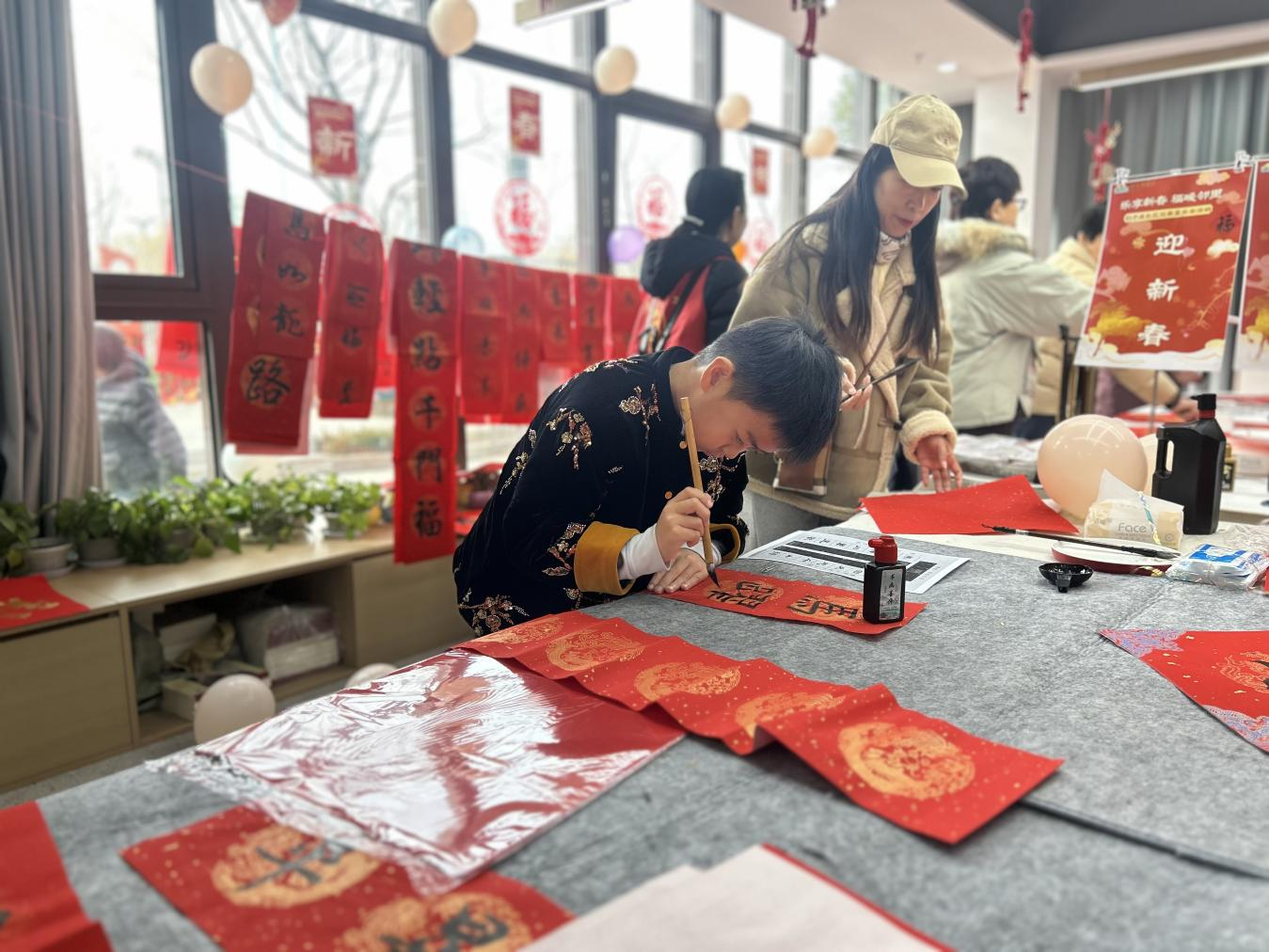 福运文创区,志愿者现场挥毫,笔走龙蛇间,“春回大地千山秀,福降人间万户欢”等一副副吉祥春联跃然纸上。一旁的福字书写区也热闹非凡,孩子们握笔学写“福”字,稚嫩的笔触满载童真与祝福。写好的春联和福字被整齐悬挂,随风轻扬,红火喜庆。居民们纷纷挑选心仪的作品带回家,为新年增添传统年味。