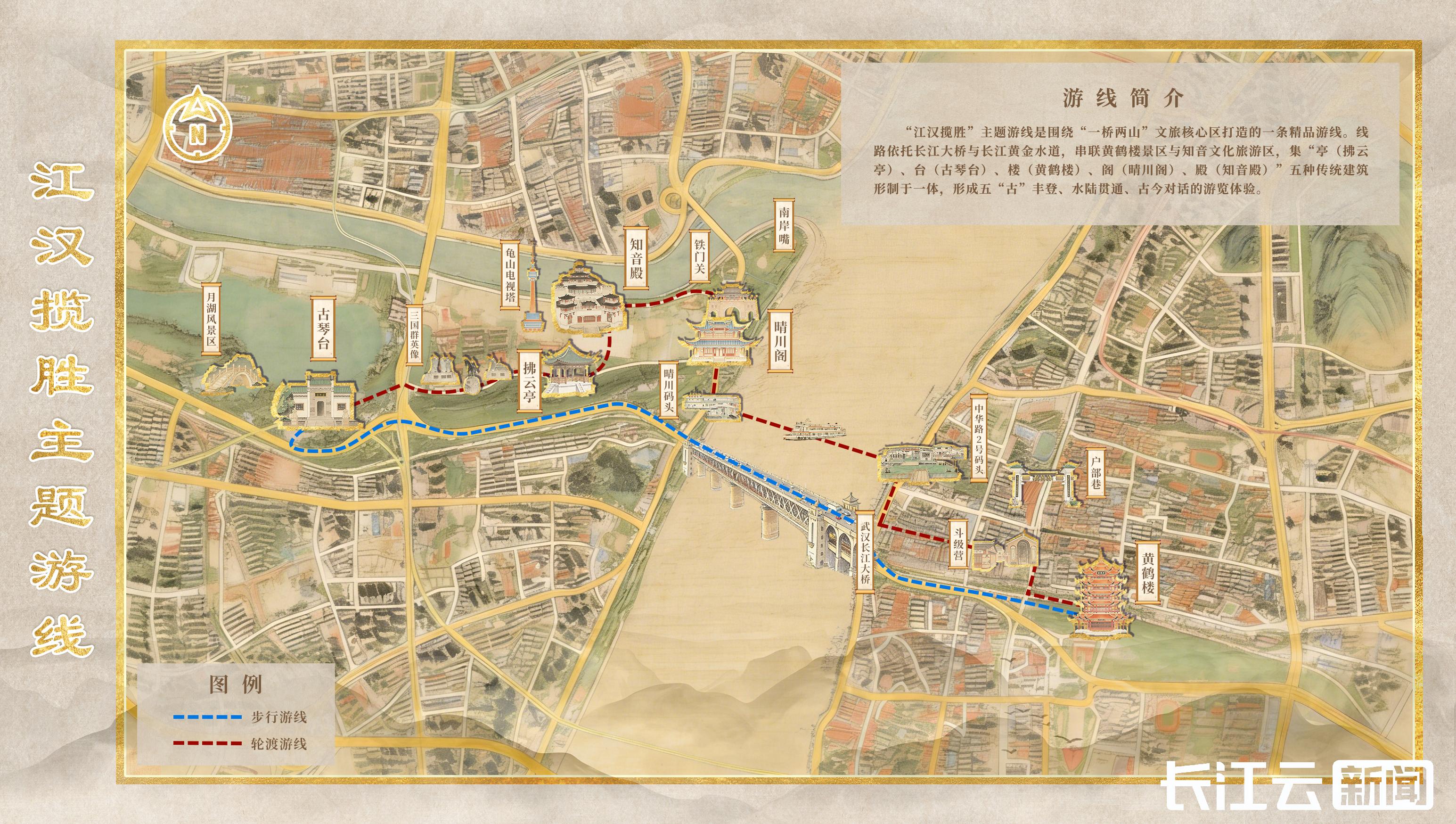 游线自蛇山之巅黄鹤楼出发,途经焕新亮相的百年老街斗级营与烟火气十足的户部巷,乘轮渡横渡长江,在航程中远眺武汉长江大桥和两岸风光,随后可前往汉阳江滩观赏晴川灯会,最终抵达龟山,探访知音殿与古琴台。线路虽不算长,却集纳两岸代表性自然风光、文化地标与城市生活场景,是一条融合自然、人文与烟火气的精品游线。
