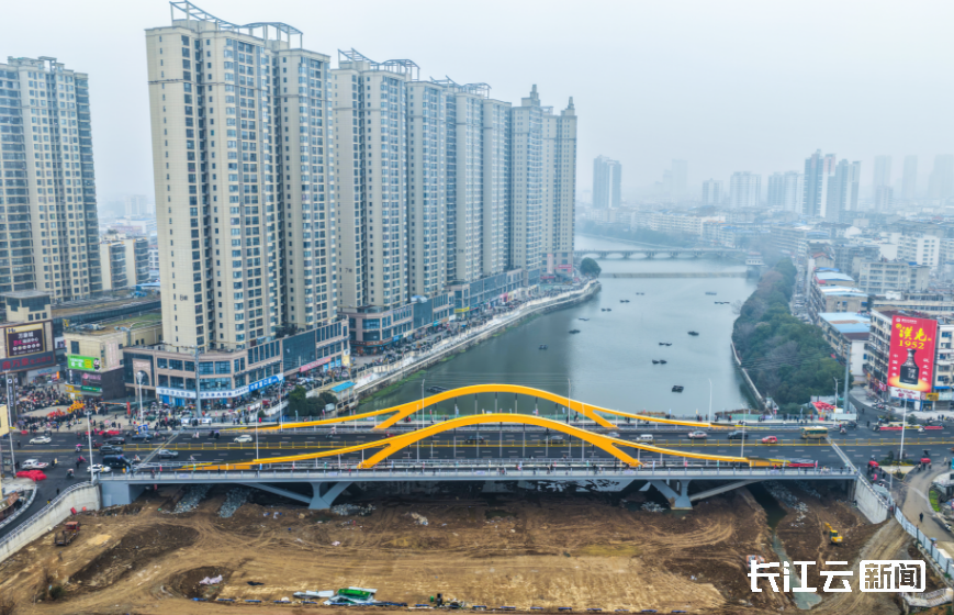 新建成的新华大桥长162.8米、宽40米,采用39米+80米+39米梁-拱组合体系桥梁,设置双向六车道+非机动车道和人行道。桥梁涉及接线道路改造总长350米(含桥长),设置平面交叉2处,桥头设置上下桥梯道4座,亲水设施及其他附属工程同步升级。