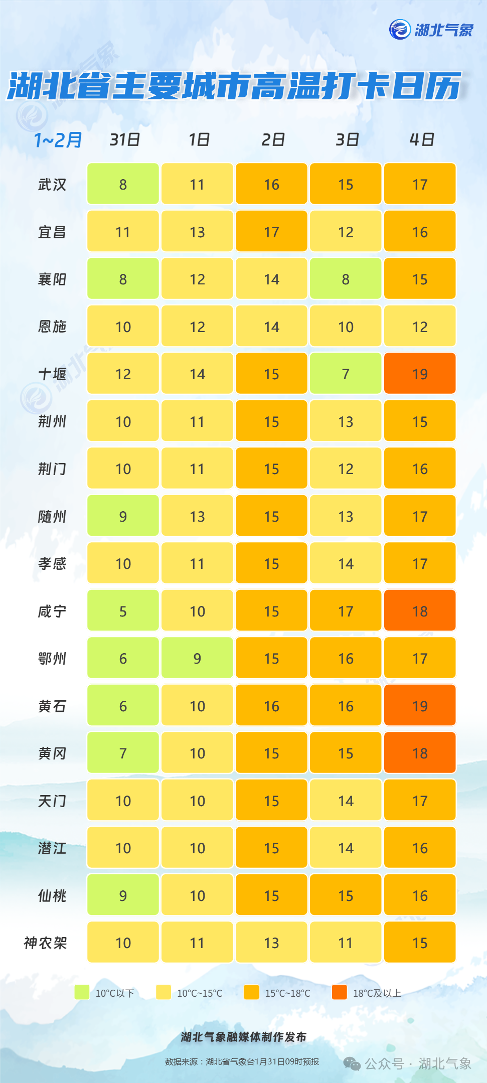 2月初湖北大部分地区最高气温将升至15℃以上,局地可达18℃+。
