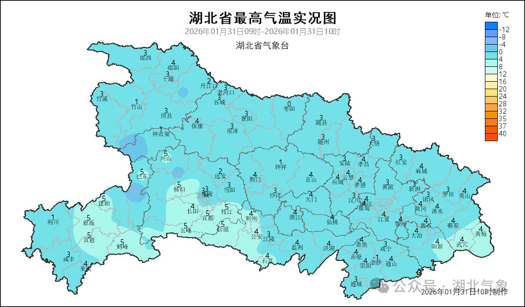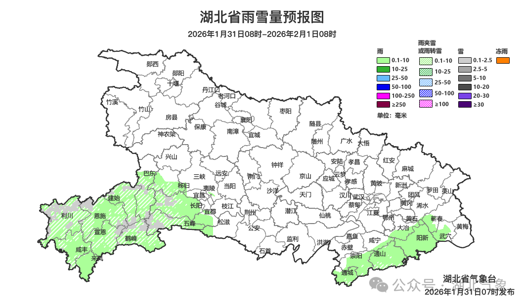 1月31日08时-2月1日08时,鄂东南零星小雨转阴天,山区有雨夹雪或雪;鄂西南阴天转小雨或雨夹雪,山区有小雪;其他地区阴天到多云。最高气温中西部9~13℃、东部5~9℃,最低气温-3~2℃,偏北风2到3级、阵风4级。