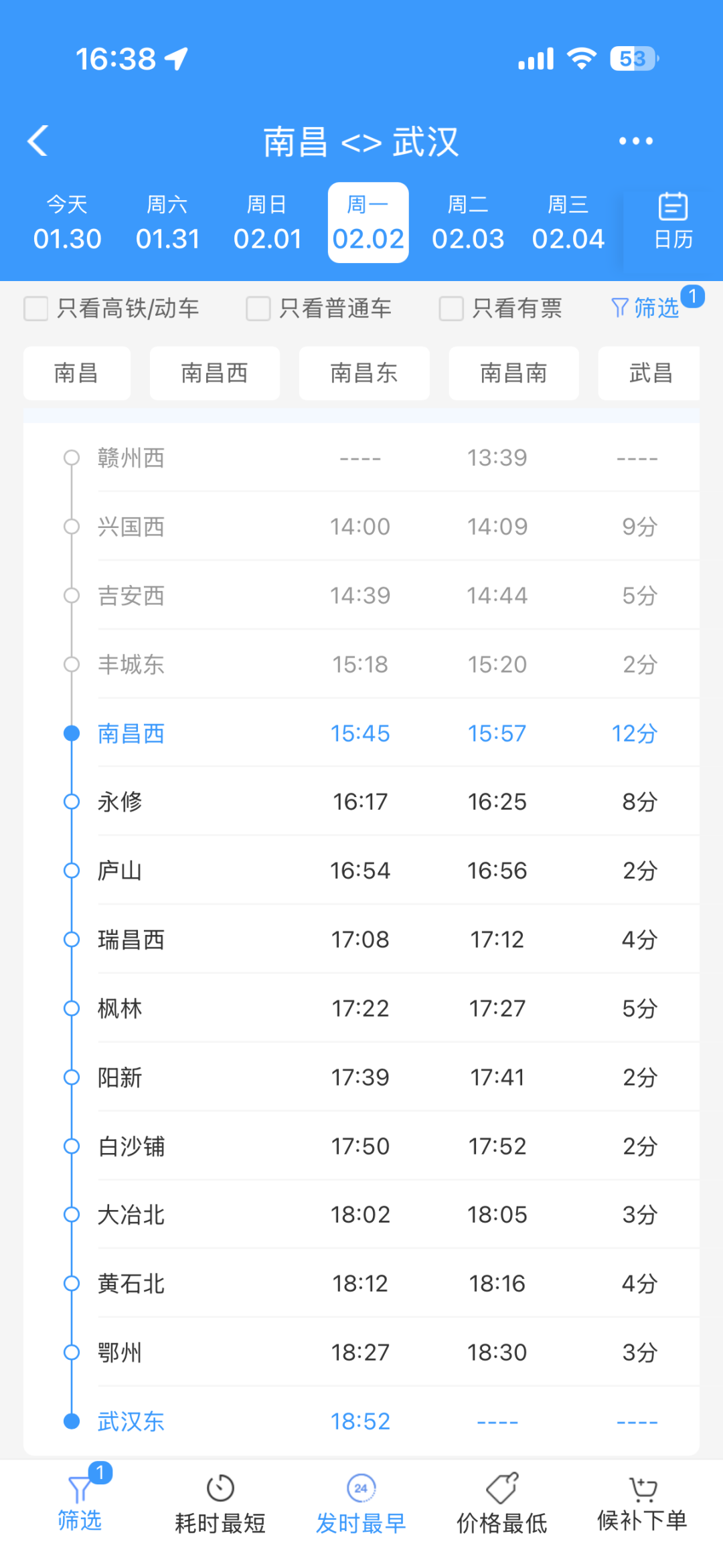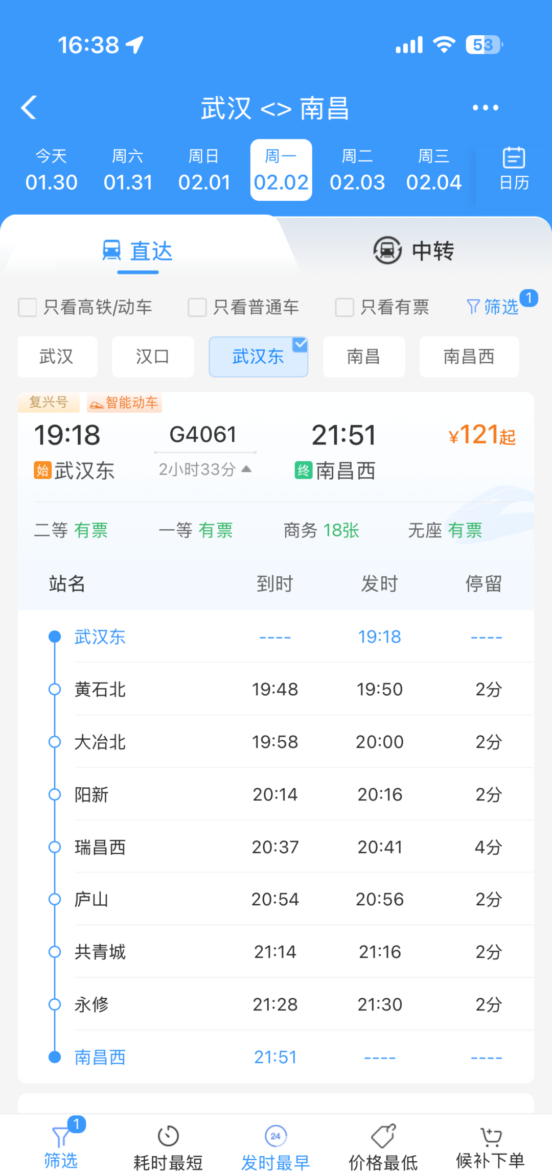 据湖北铁路集团轨道运营有限公司消息,2月2日起,武汉东站新增两趟跨省高铁列车,分别为武汉东直达南昌西的G4061次,以及赣州西直达武汉东的G4062次。其中,G4061次列车19:18从武汉东站发车,经停黄石北、瑞昌西、庐山等8个站点,21:51抵达南昌西站,全程仅2小时33分钟,实现两地高效联通;G4062次列车13:39从赣州西站发车,经停南昌西、庐山、阳新等14个站点,18:52抵达武汉东站,满足沿线多地旅客快节奏出行需求。