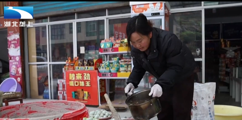 寒冬时节,恩施州咸丰县朝阳寺镇的一家作坊里正忙着做皮蛋。老板一家先将鸭蛋洗净,再按祖传比例,用石灰、盐、碱面和熬好的香料水调成料泥。鸭蛋晾干后,在桶里铺一层蛋、抹一层泥,层层叠好进行腌制。据作坊店老板介绍,鸭蛋虽然做起来耗时,但买的人越来越多。特别是最近,订单不断,作坊里每天都很忙。