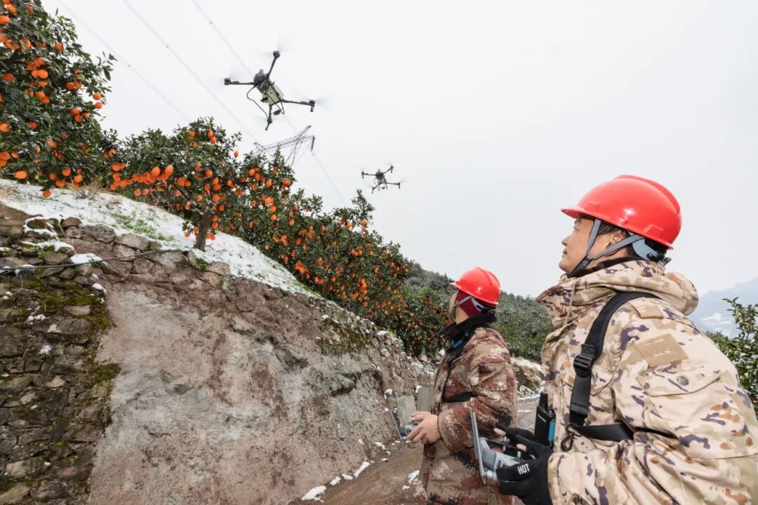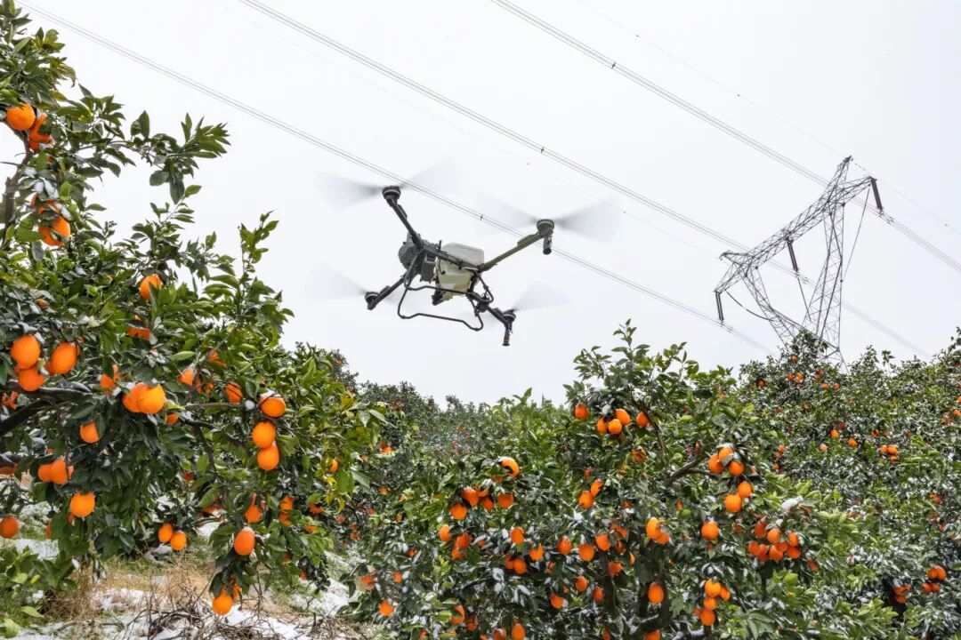 1月20日,秭归县遭遇低温雨雪冰冻天气,正值越冬关键期的脐橙产业面临严峻考验。在郭家坝镇的脐橙园里,秭归县峻鑫农业服务有限公司的飞手们操作无人机腾空而起,低空平稳飞行,凭借强劲的下旋气流,精准吹散树冠积雪,有效缩短冰雪与枝叶接触时间,降低枝干压断和叶片冻伤风险。