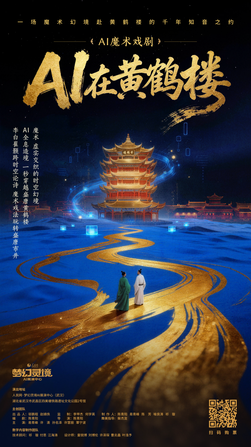 据悉,《AI在黄鹤楼》将更名为《AI上黄鹤楼》,目前已获得各级文旅部门的重点关注。春节及后续档期,将在“梦幻灵境”AI展演中心(武汉)进行长期驻演。