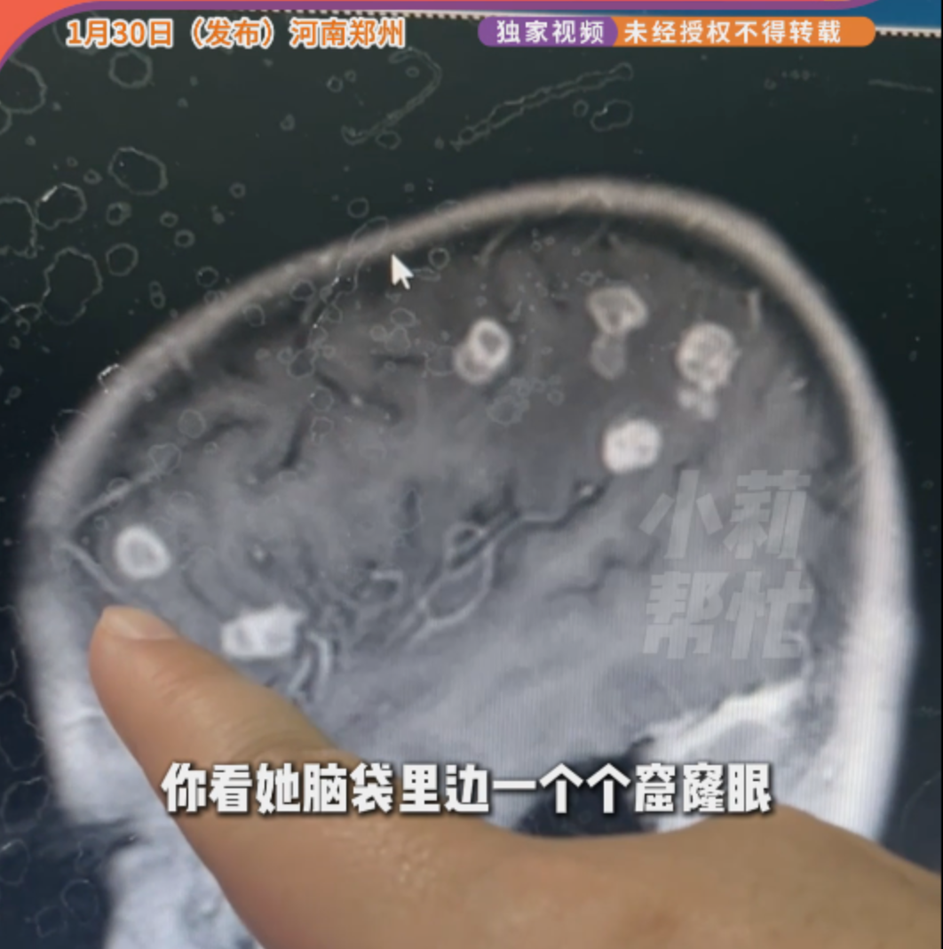 孩子的脑部影像显示有20多个大小不一的空洞,像被什么东西啃食过一般。“一个个窟窿眼,大概20几个!非常罕见。”医生指着影像解释道,“这是烟曲霉感染导致的脑组织破坏。”