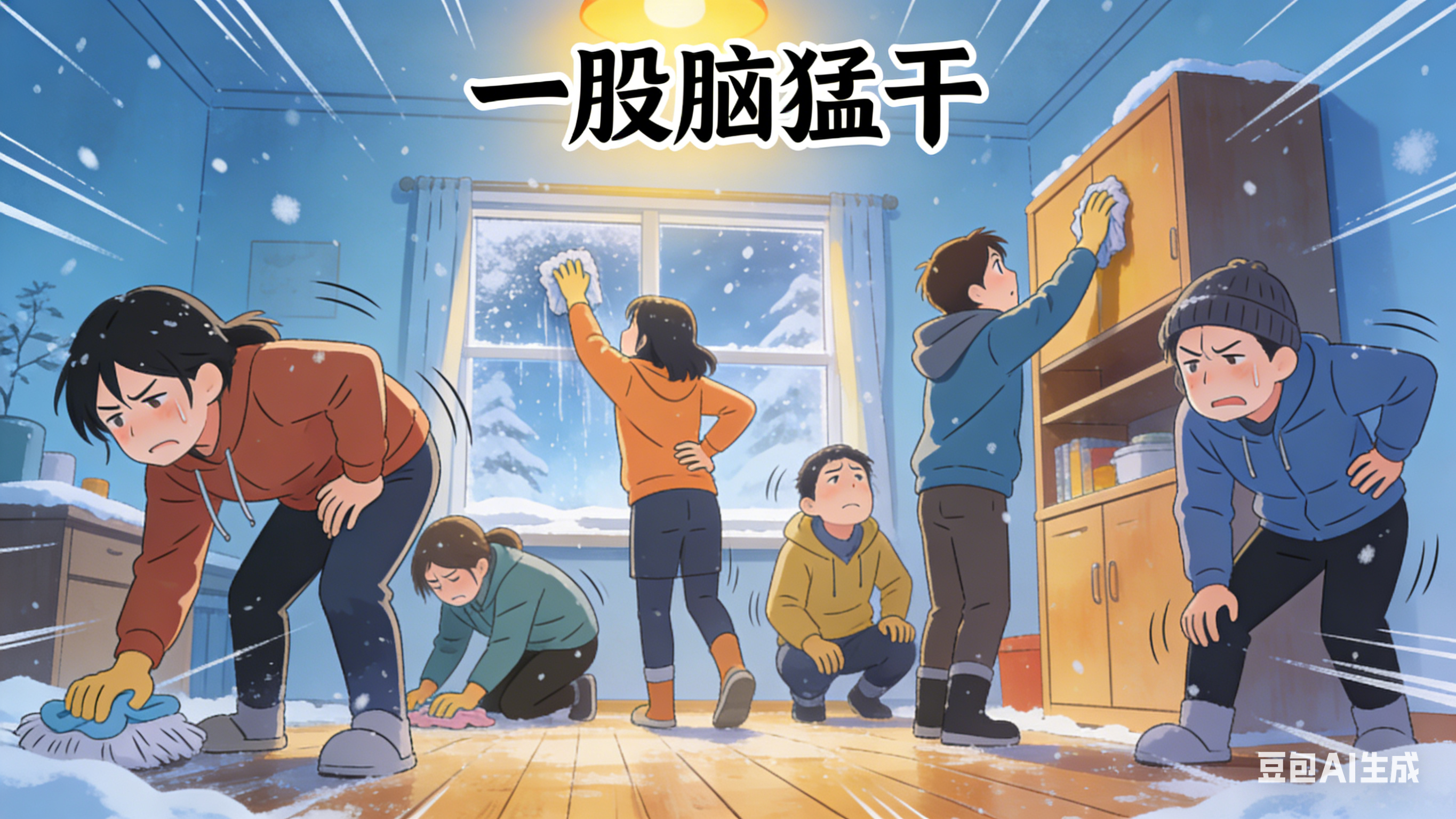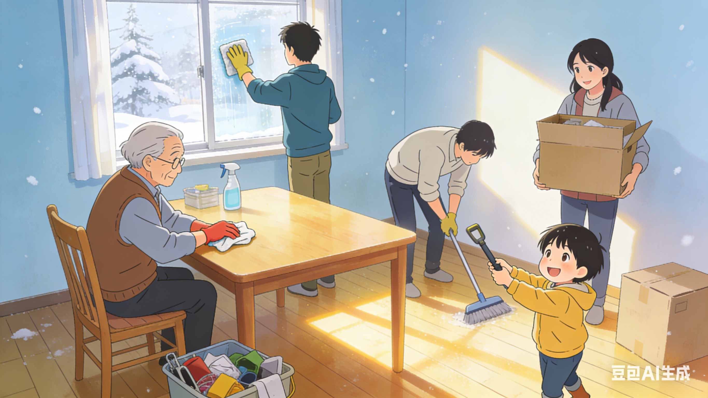 全家一起大扫除,既能提高效率,又能避免单个人过度劳累。老人负责整理轻便的杂物、擦桌子,年轻人负责擦窗户、拖地板、搬重物,小孩可以帮忙递工具,分工明确,轻松又热闹。