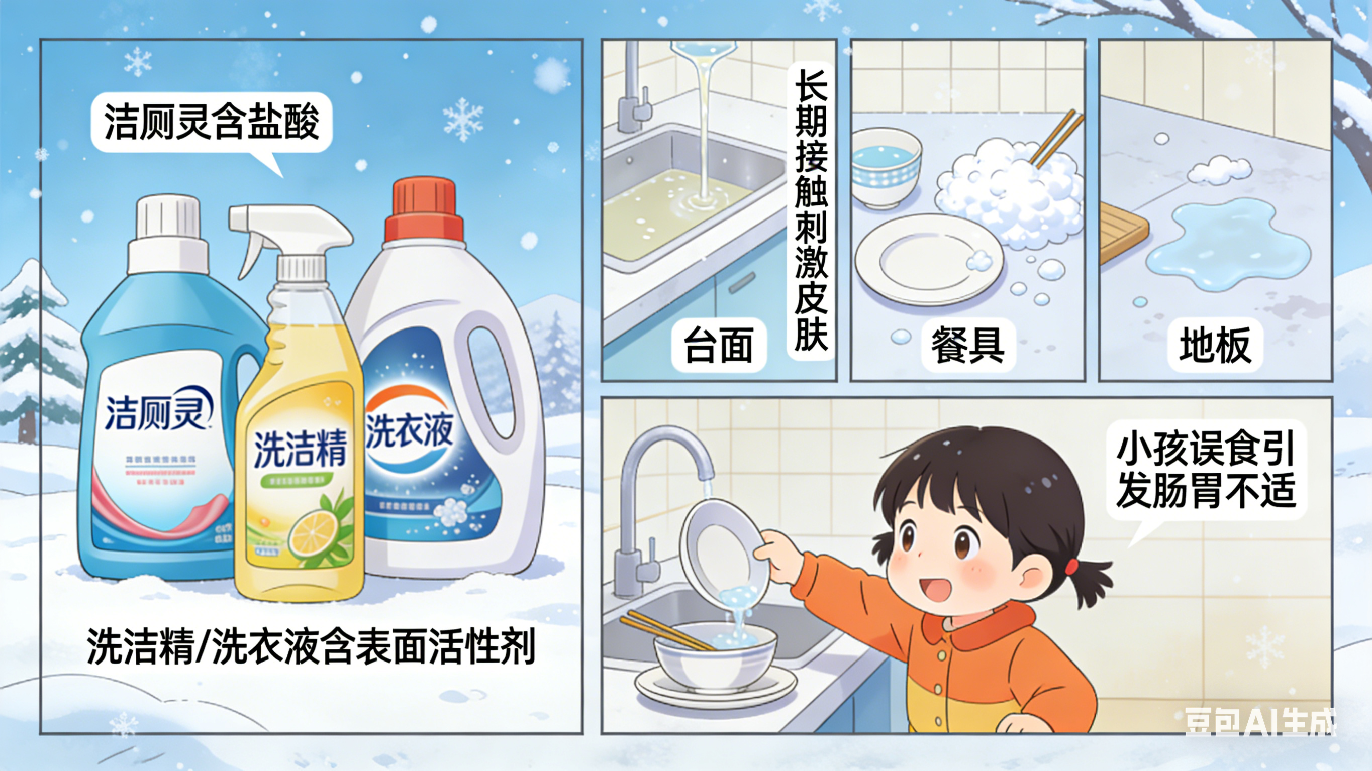 洁厕灵中含有盐酸,洗洁精、洗衣液中含有表面活性剂,这些成分若残留在台面、餐具、地板上,长期接触会刺激皮肤,误食(尤其是小孩)还可能引发肠胃不适。