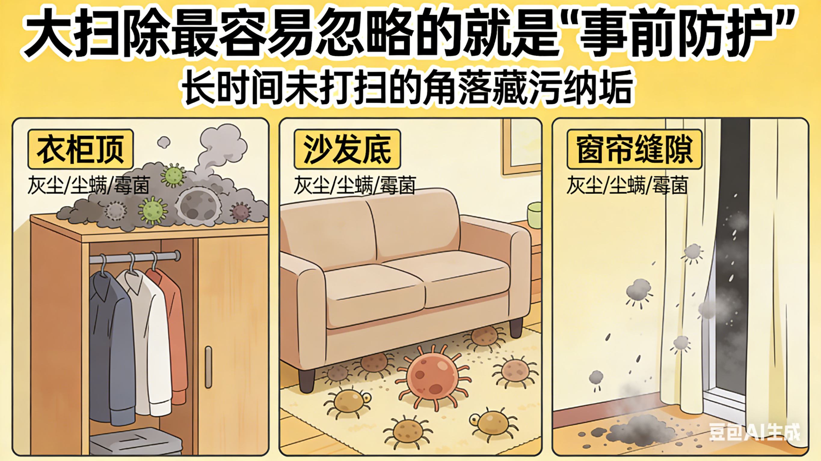大扫除最容易忽略的就是“事前防护”,尤其是长时间没打扫的角落(比如衣柜顶、沙发底、窗帘缝隙),藏满了灰尘、尘螨和霉菌。