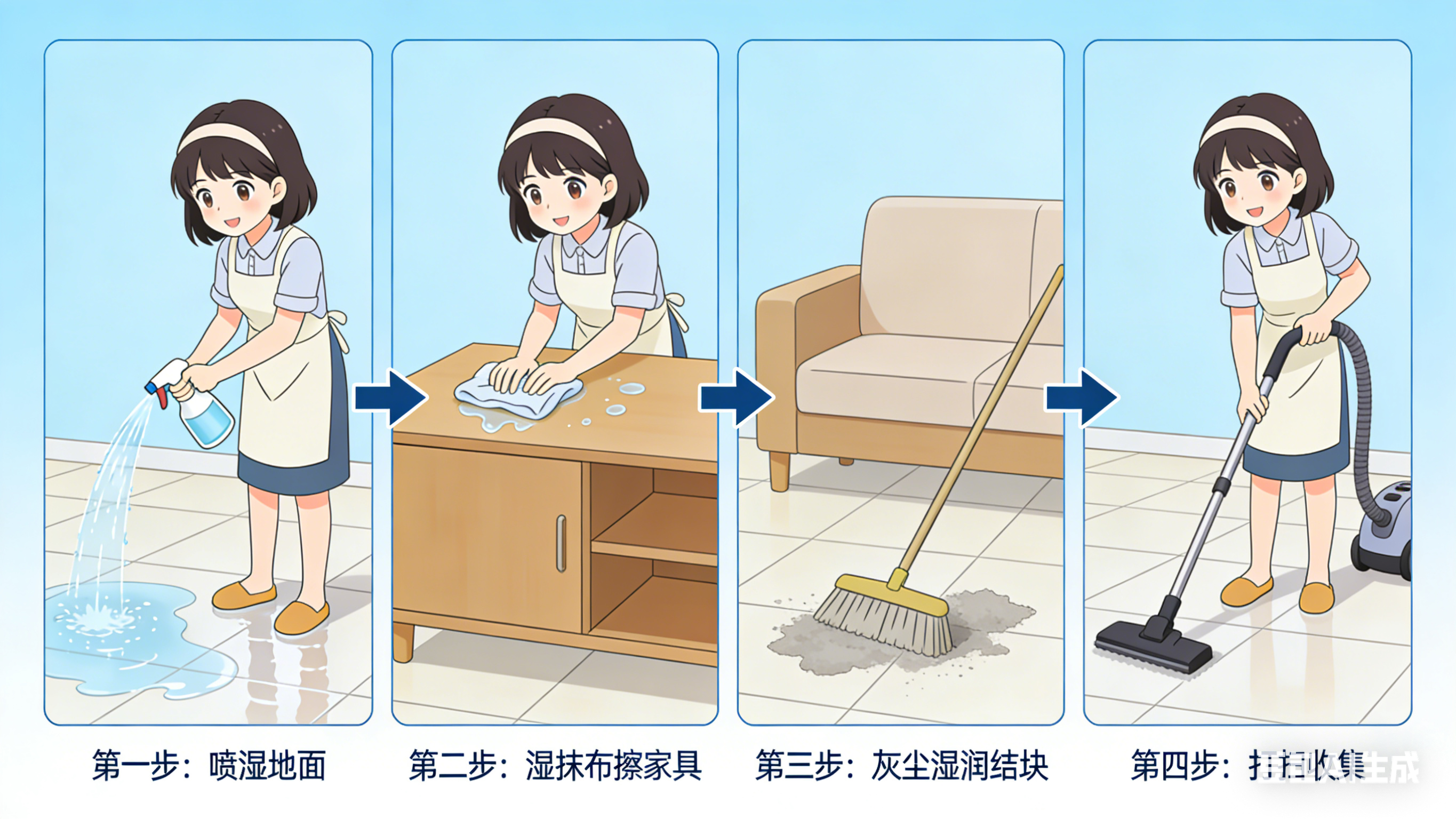 打扫时别先扫干灰、擦干家具,先往地面、家具表面喷一点点清水(或者用湿抹布擦一遍),让灰尘湿润结块,再打扫,这样能避免灰尘飘得满屋子都是,减少吸入风险。