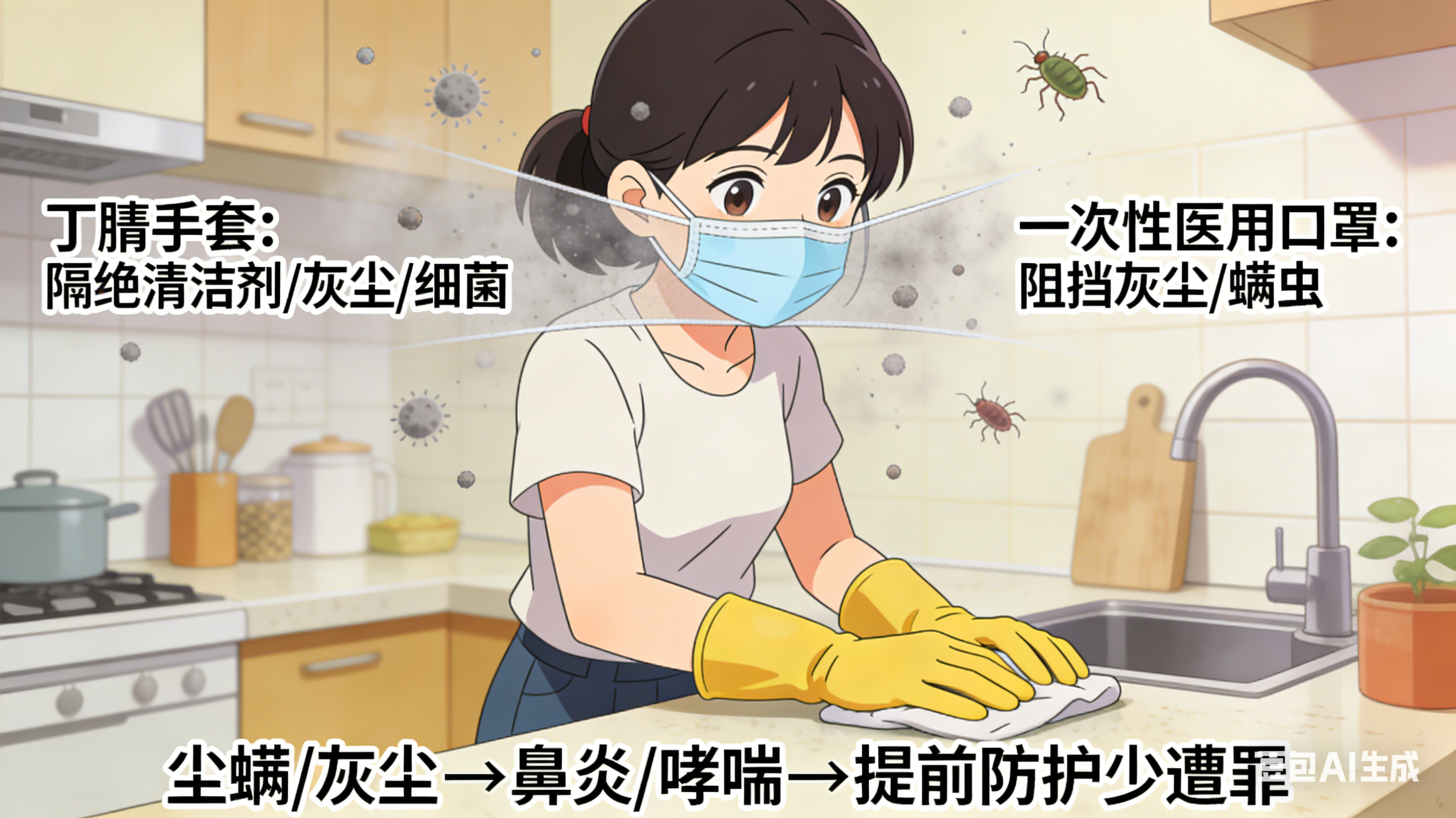 口罩能挡住漂浮的灰尘、螨虫,尤其是家里有鼻炎、哮喘患者,一定要戴严实,别嫌麻烦——尘螨和灰尘颗粒一旦吸入,可能诱发鼻炎发作、咳嗽胸闷,提前防护能少遭罪。