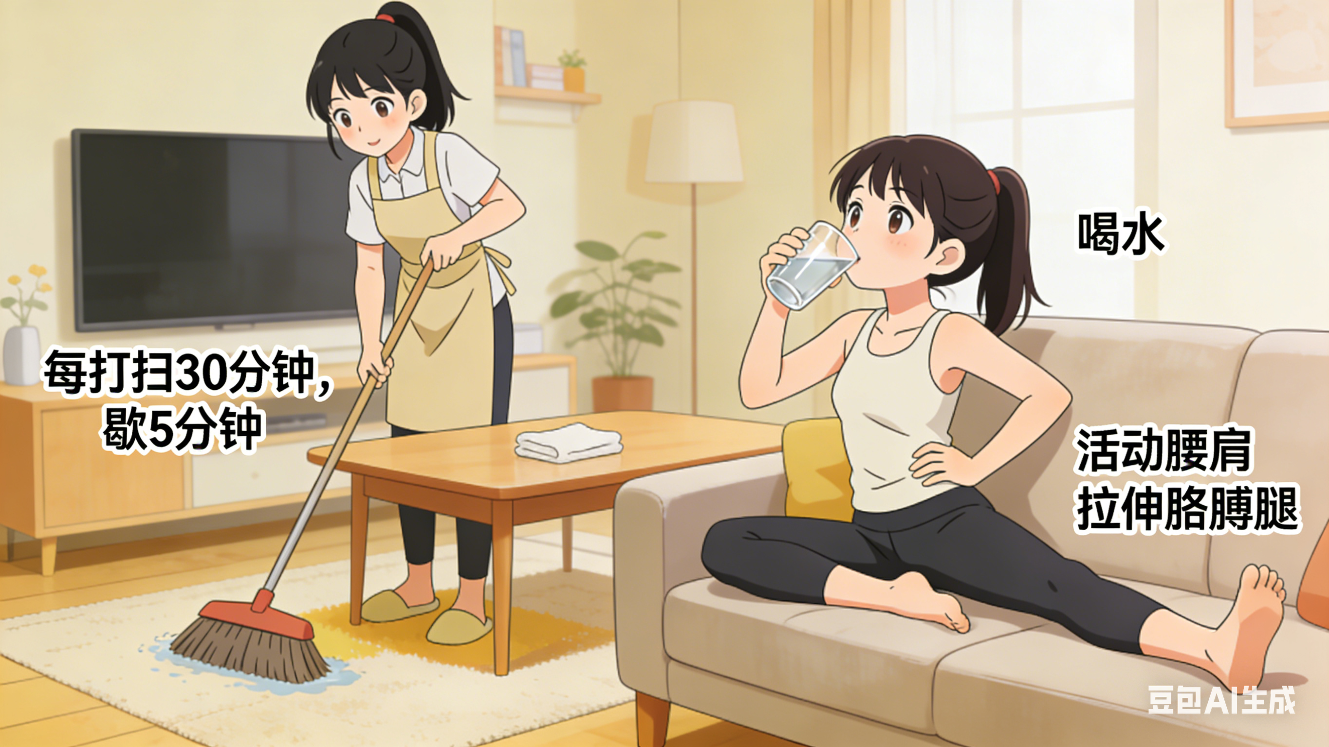 别一次性忙上几个小时,每打扫30分钟,就停下来歇5分钟,喝口水、活动活动腰肩,拉伸一下胳膊和腿,缓解肌肉疲劳,避免过度劳累。