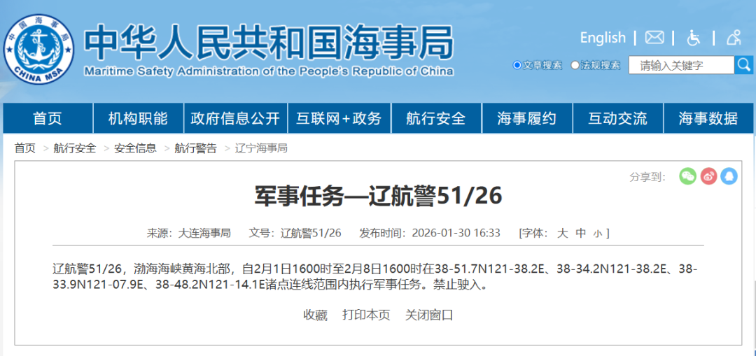 据中国海事局网站消息,大连海事局发布航行警告,自2月1日16时至2月8日16时,渤海海峡黄海北部部分水域范围内执行军事任务,禁止驶入。