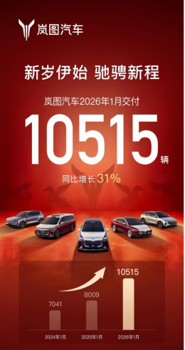 2月1日,岚图汽车发布1月销量数据,单月交付10515辆,同比增长31%。2025年,岚图全年交付突破15万辆,实现连年跃升;2026年开局迎来开门红!同时,赴港上市更进一步,已获中国证监会备案,市场与资本市场双向发力,进一步夯实“央国企高端新能源第一品牌”地位。