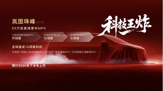 2026年,岚图汽车将完成MPV系列化布局,重磅推出“50万级最强豪华MPV”,代号“珠峰”,与岚图梦想家形成组合,剑指全品类MPV销冠及全球新能源MPV引领者地位。该车型将全球首发12项黑科技,是全球首搭L3级自动驾驶MPV和情绪价值最高的MPV,将于2026下半年上市,成为岚图汽车夯实MPV领导地位的核心力作。
