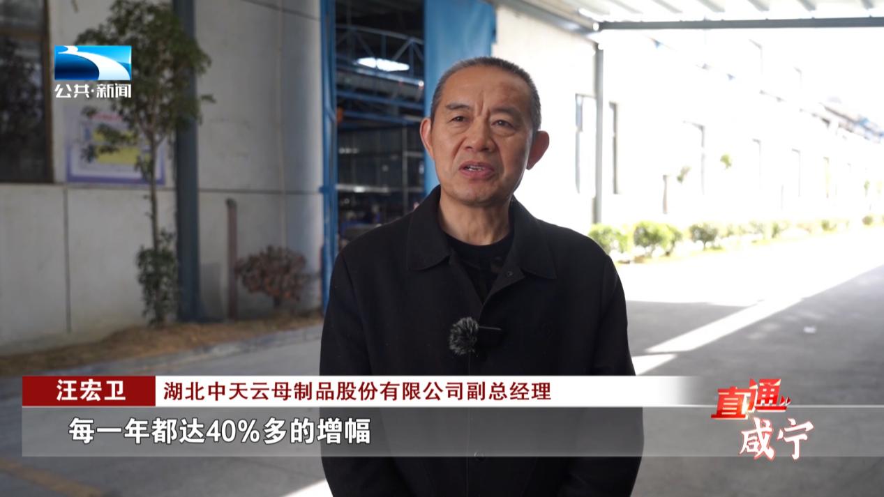 湖北中天云母制品股份有限公司副总经理 汪宏卫:刚好搭上了新能源这班车,使我们的发展,每一年都达40%多的增幅。