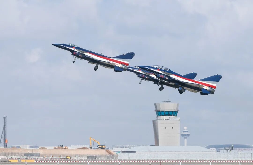 “cleared for takeoff(允许起飞)”,接到塔台起飞指令后,6架歼-10表演机在云底高600米的条件下,分2批快速滑跑起飞,伴随着巨大轰鸣声冲向天际,在空中完成集合编组后,随即飞往机场附近海面上空。