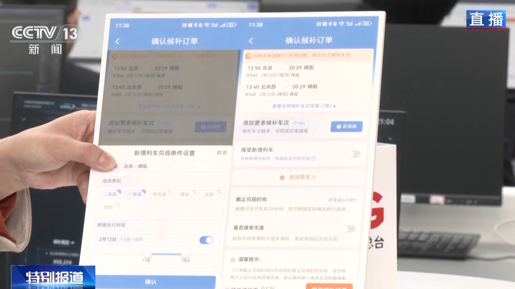 铁科院电子所数智客运研究室赵千谊:想要提高购票成功率,我们帮大家梳理了一些小窍门,在您提交候补的时候,尽量多选择一些车次,车次越多,候补成功率越高,可以选择3个乘车日期,60个候补车次。我们建议旅客打开“接受新增列车”这个按钮,当有符合您需求的新增列车时,系统会自动为您兑现,增加您的购票成功率。还有一个小细节,在“接受新增列车”的选项下面,您可以选择希望出行的时间段和希望选择的座位类型,这样就更容易候补到满意的车票。