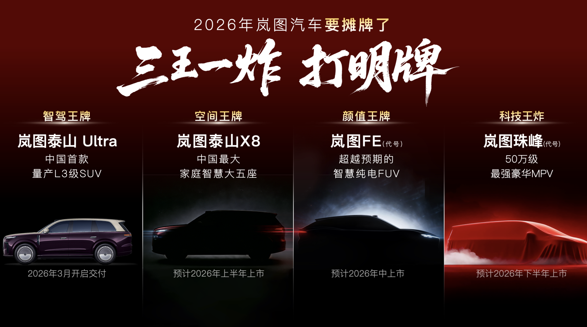 2026年,岚图产品矩阵重磅升级,将推出的四款新产品,分别是中国首款量产L3级SUV岚图泰山Ultra、“庭院级大五座SUV”岚图泰山X8、代号“FE”的全新FUV、代号“珠峰”的旗舰MPV,覆盖SUV、FUV及MPV三大品类,全部搭载L3级智能辅助驾驶硬件。