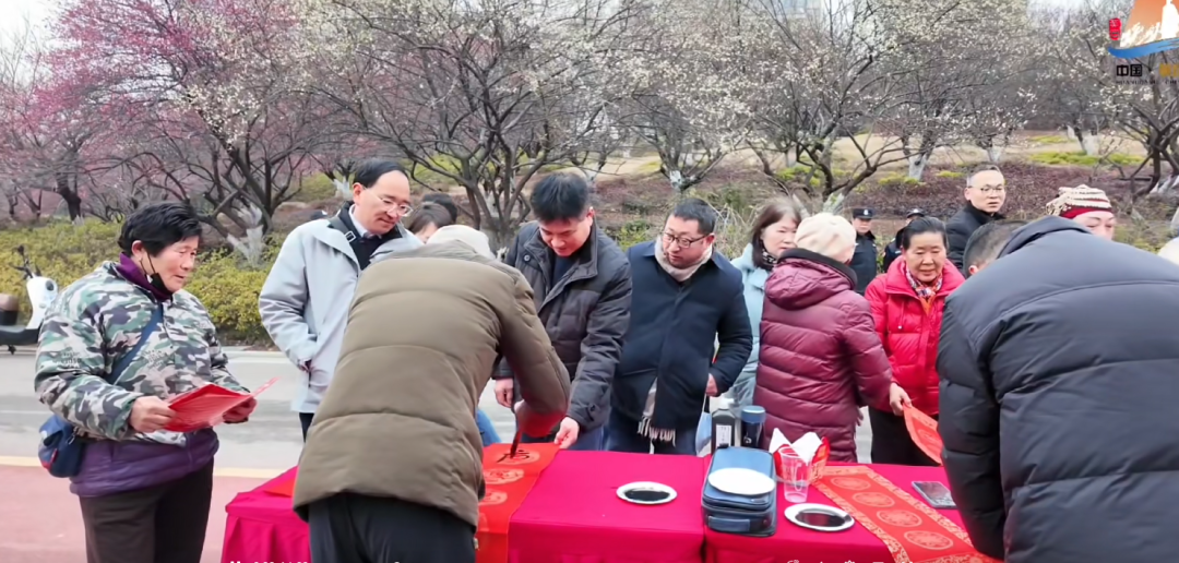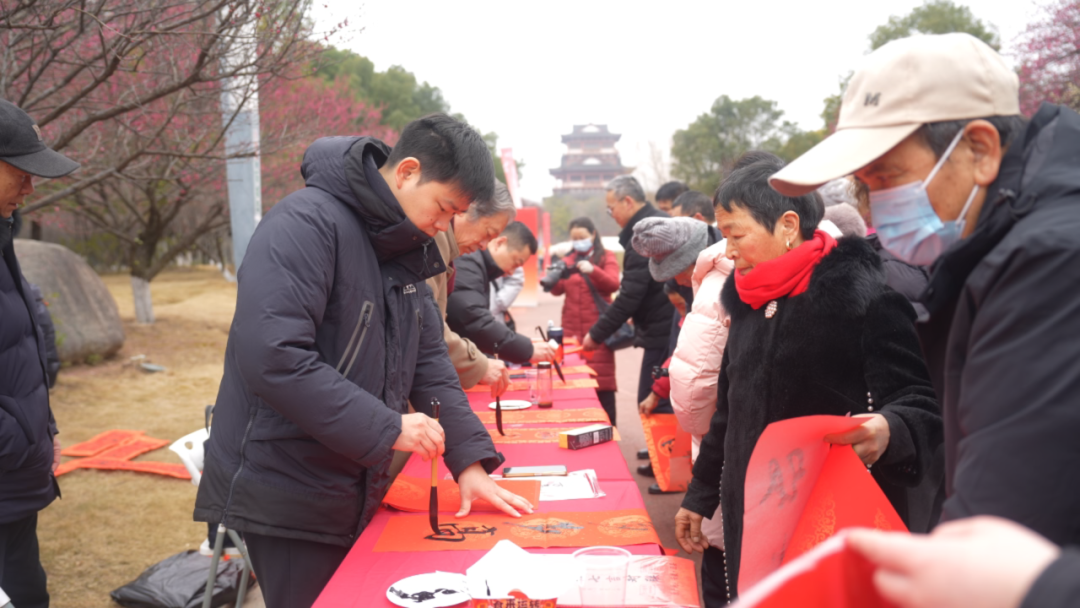 在梅园的一角,书法爱好者正挥毫泼墨,为游客们免费书写对联。他们神情专注,笔下的字迹或刚劲有力,或飘逸灵动。一副副充满新春祝福的对联在他们的笔下诞生,散发着淡淡的墨香。游客们围在一旁,认真挑选着自己心仪的对联,脸上洋溢着幸福的笑容。
