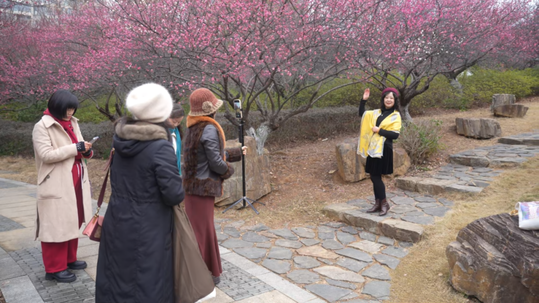 漫步在梅园之中,处处皆是绝佳的拍照打卡点。娇艳欲滴的梅花在枝头绽放,与古色古香的亭台楼阁相互映衬,构成了一幅如诗如画的美景。游客们纷纷拿出手机、相机,记录下这美好的瞬间。有的游客站在梅花树下,比出可爱的姿势;有的游客则与家人朋友一起,在梅花簇拥中留下温馨的合影。