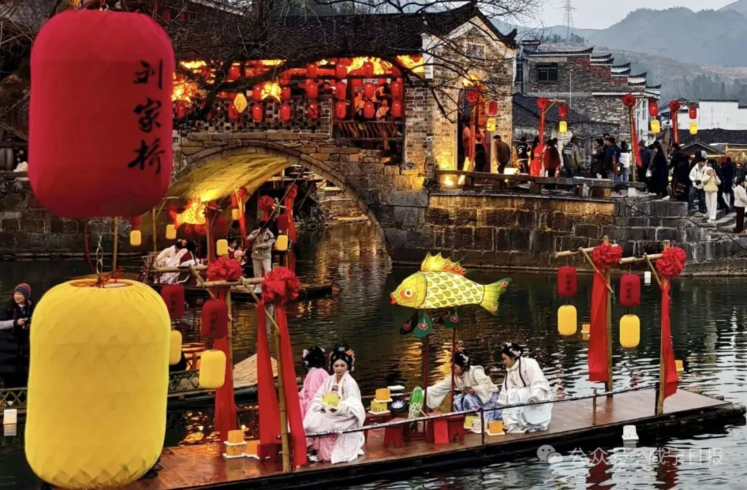 暮色四合,华灯初上,青砖黛瓦的刘家桥古村落被暖光包裹。青石板路泛着淡淡的光泽,河畔的灯笼次第亮起,作为咸宁市级非遗项目,“天河金丝龙”今年首次以完整的演出形式亮相在游人面前,消息一出,便吸引了周边群众和远道而来的游客,大家早早围满街巷、站满河畔,满心期待这场非遗之约。