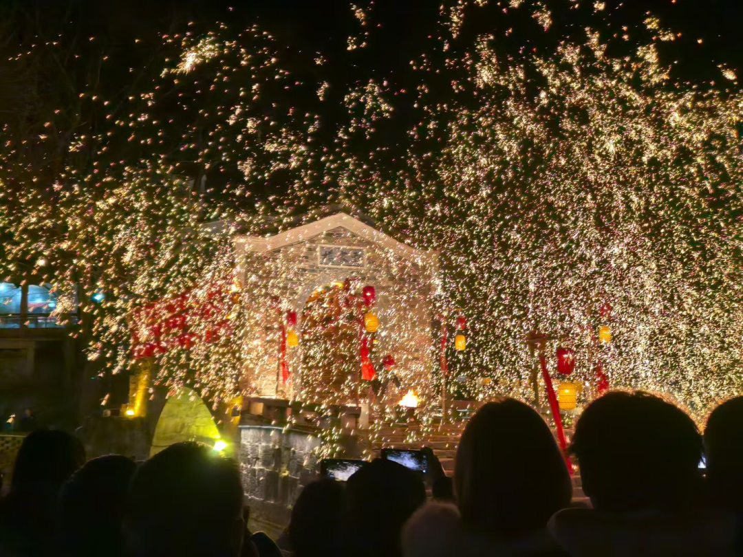 当晚,除了金丝龙表演,打铁花、火舞船、火把舞等节目也轮番上演。其中,打铁花环节最为震撼,1600℃的铁水被奋力击向夜空,瞬间化作漫天星火,如天女散花般洒落,与河畔的灯笼、水中的河灯交相辉映,美不胜收,将现场气氛推向了高潮。与此同时,现场的特色小吃区也十分热闹,合菜面、桂花汤圆、糍粑等本地特色小吃,香气扑鼻,吸引了不少游客驻足品尝。古镇的餐饮、民宿和特色市集,迎来了一个繁忙而喜悦的夜晚。
