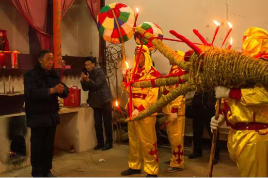 傍晚6时许,一声清脆的吆喝声划破夜空,五条金光熠熠的天河金丝龙如期登场,瞬间点燃全场热情!其中,主龙长达15米,七节龙身由七位壮汉稳稳擎起,步伐铿锵;四条小龙紧随其后,灵动俏皮,在青石板路上蜿蜒前行。沿途家家户户鞭炮齐鸣,青烟缭绕中,金龙时隐时现,宛如游走人间的祥瑞使者。而这五条草龙,集结了近30位村民一个多月的心血,每一根稻草都藏着匠心与坚守。作为这项技艺的第九代传承人,陈大元老人见证了金丝龙的变迁。“‘天河金丝龙’起源于1748年,是用稻草制成的,稻草一根一根像金丝,所以叫天河金丝龙。我们过去元宵节挨家挨户,家家都玩到,祈福,龙保佑她(他)平安无事,来年风调雨顺,五谷丰登,全家平安。”