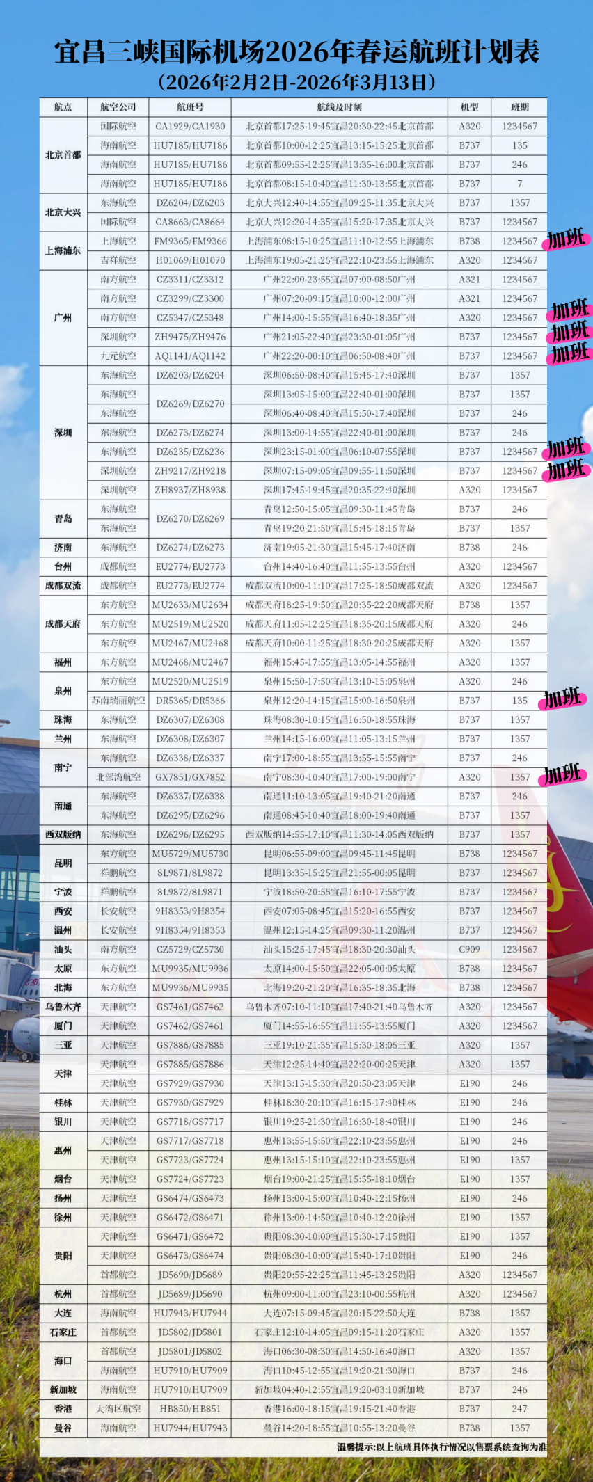 2026年春运自2月2日至3月13日共计40天,三峡机场联合各航空公司,计划执行航班3540架次,同比2025年春运增长6.9%。在前期已加密的宜昌至上海浦东、广州、深圳、南宁、泉州等热门返乡与旅游航线基础上,本次春运期间将进一步增班:2月4日至2月15日、2月21日至3月1日,南方航空加密广州=宜昌航线,每日一班;2月5日至3月13日,九元航空加密广州=宜昌航线,每日一班。航线加密后,广州方向每日航班最多可达10架次,本次春运整体加班航班共计366架次。春运期间客流将呈现探亲流、务工流、学生流、旅游流叠加的特点,机场旅客运输量预计突破41.8万人次,较2025年同期增长8.4%。
