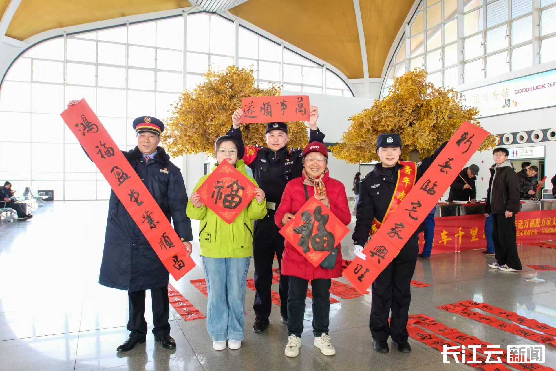 与此同时,襄阳铁路公安处联合铁路运输检察院、法院,组建“公检法企”联合宣传队,在春运首日走进襄阳工务段等铁路单位,开展“平安春运·法治同行”专题活动。通过定制化展板、以案释法、有奖问答、法律咨询等形式,为1100余名干部职工上了一堂生动的法治课。此外,各车站也洋溢着浓厚的“年味”:襄阳东站、宜昌东站、荆州站等派出所邀请书法和拓印老师现场书写春联、制作木拓,赠予往来旅客;乘警支队联合襄阳客运段在高铁列车上开展“送万福进万家”春运主题活动,乘警将反诈知识与魔术表演巧妙融合,在欢声笑语中揭秘诈骗套路。