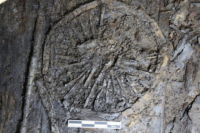 图:荆门沙洋林场遗址K2出土漆木车轮痕迹