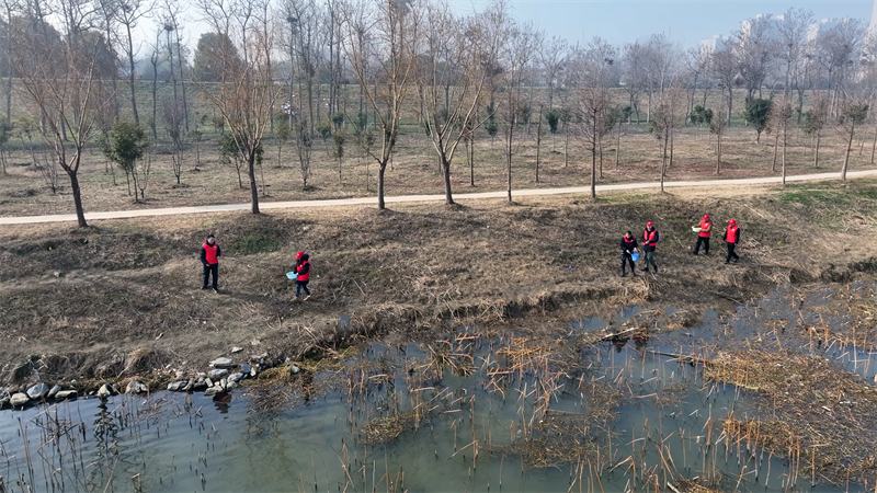 在宜城万洋洲国家湿地公园,工作人员正将玉米等食物均匀地抛撒在鸟儿经过的地方,定时开展食物投喂工作,为候鸟越冬提供充足的食物来源。