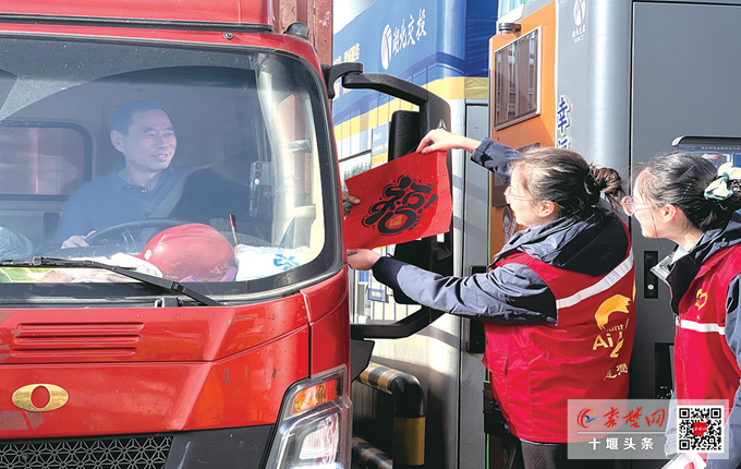 湖北交投鄂西北运营公司工作人员为司机送“福”字。