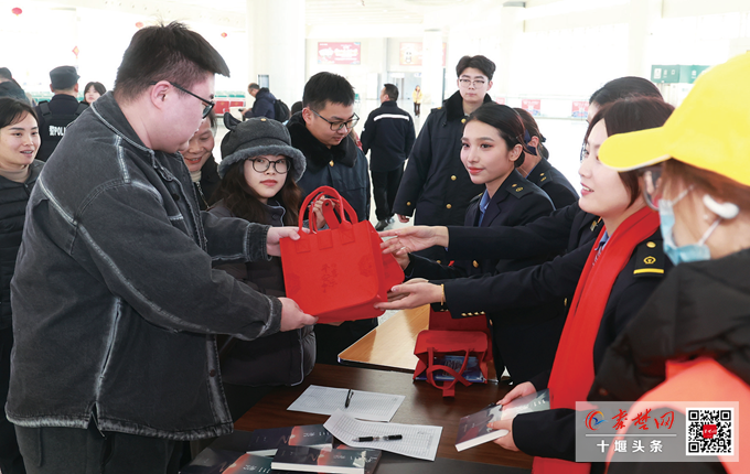 2月2日上午10时,汉十高铁十堰东站候车大厅内,广播声清晰悦耳,文艺演出正在火热进行,舞蹈串烧、歌曲独唱等节目赢得旅客阵阵掌声。车站工作人员向旅客免费发放“平安喜乐”大礼包,内含定制台历、高铁模型及12306网站VIP二维码,旅客可通过二维码便捷查询车次、办理购票退改签、预约重点旅客服务。