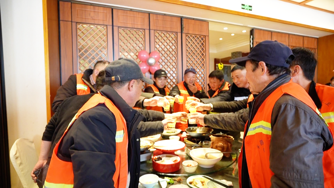 红烧肉、花西豆棍、红烧鱼、羊肉汤……一道道美味佳肴被端上桌,朴实的环卫工人们相互祝福、举杯欢庆,脸上洋溢着幸福的笑容。