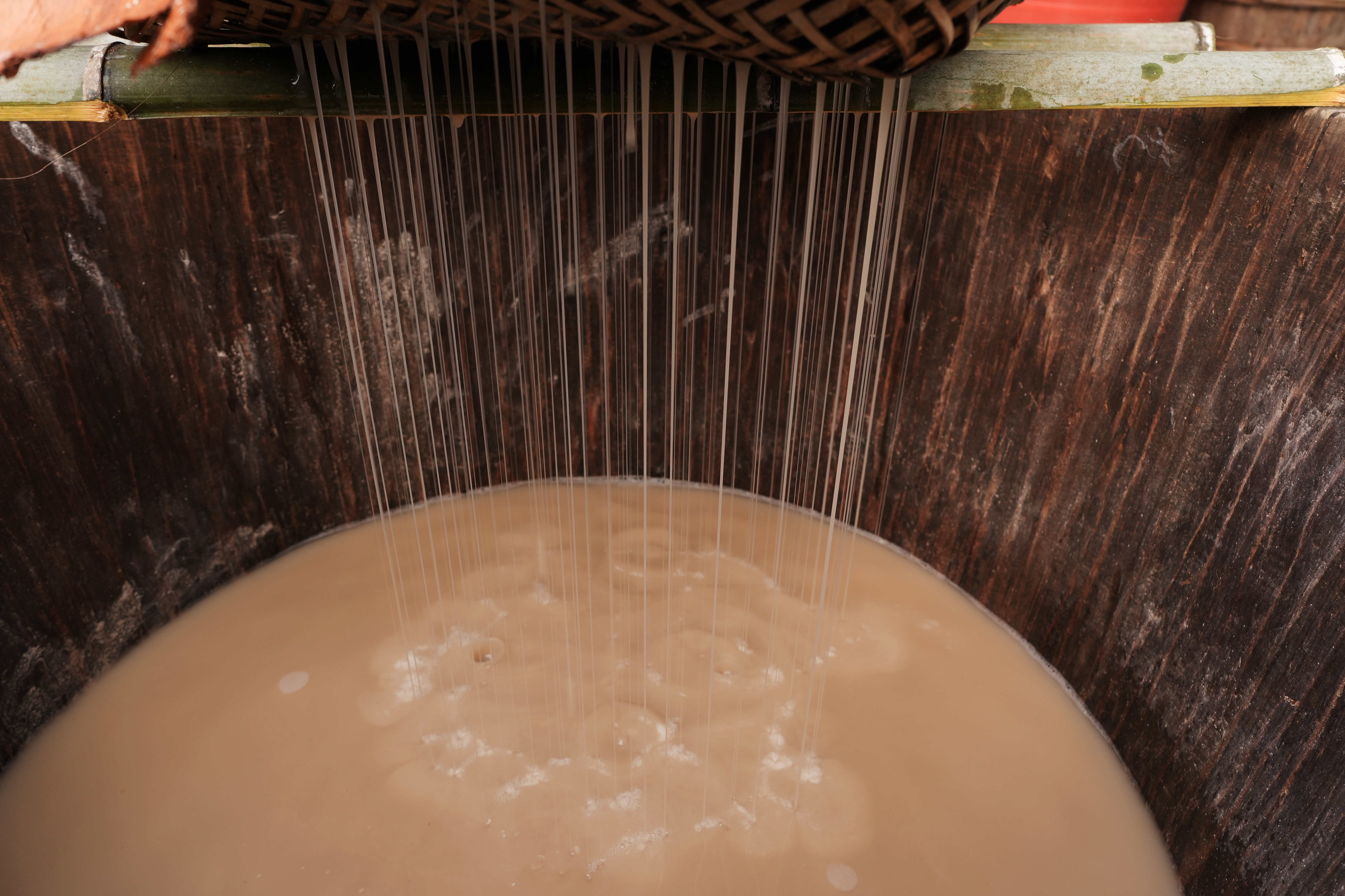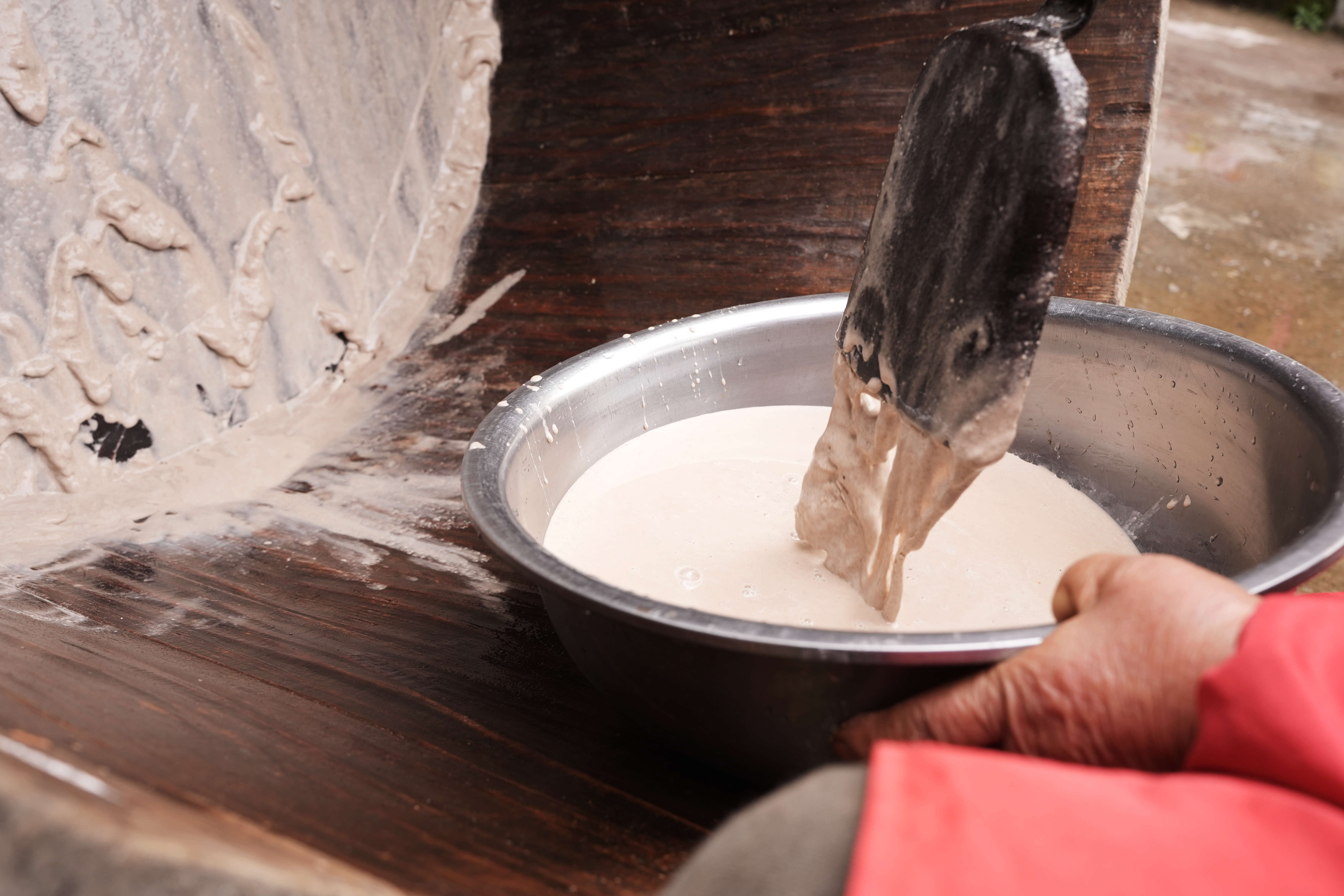 生产现场摆着两口大小不一、高低错落的大水缸,上面大缸中装的是已经捶烂的蕨根,加水搅拌后,含有淀粉的浑浊液体便从缸底的孔中流出,顺着渡槽般的竹笕流向铺有纱布和棕片过滤的下一个大缸中沉淀。流水线作业,两三个小时过后,处于下游的大缸底部便沉淀起一层带着油浸色的蕨粉。设备有些原始,甚至简陋,但十分管用。积淀在缸底的蕨粉,细紧严实,乃至收集起来都十分费劲。用老向的话说,锅铲撬断了都不一定刮得下来!