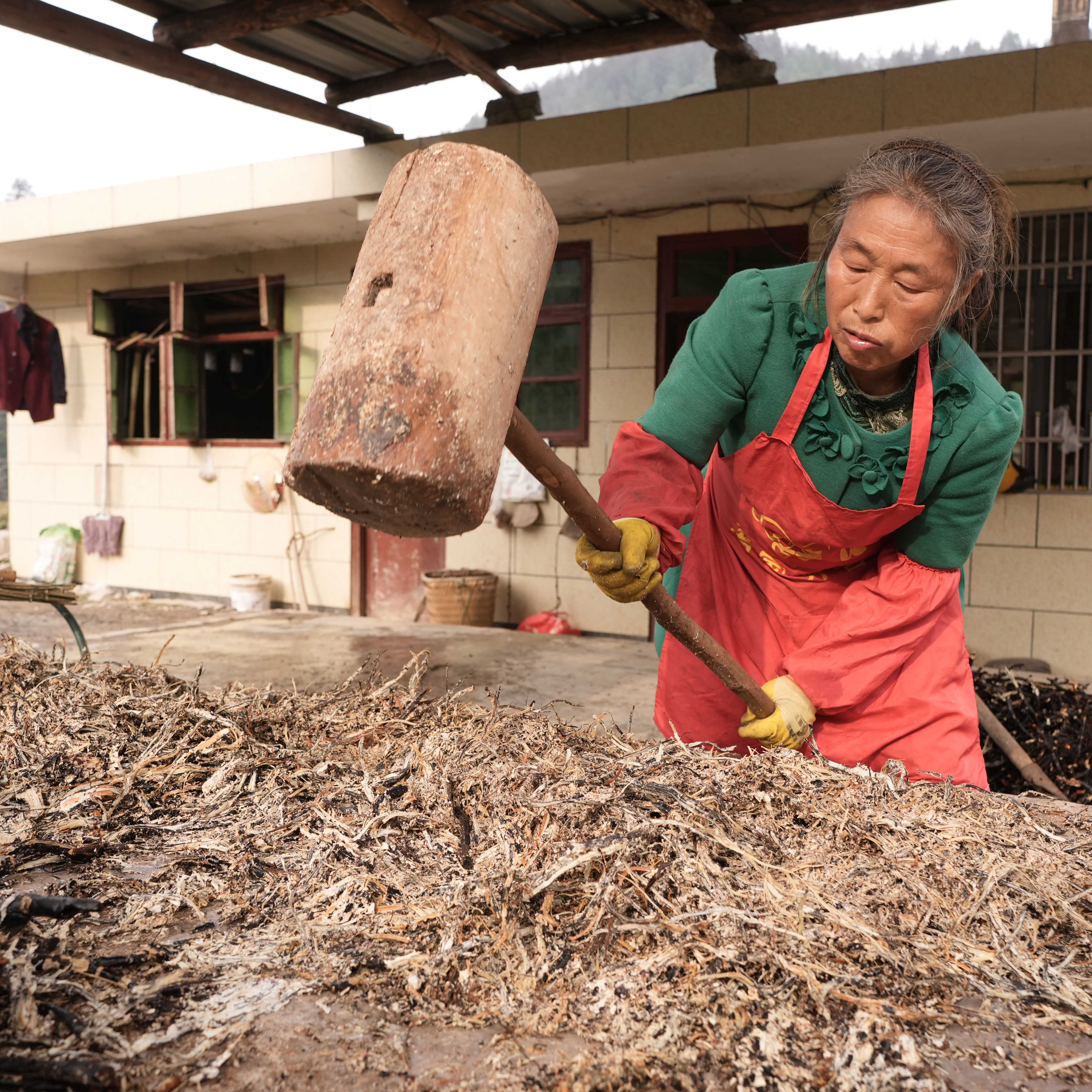 咸丰县黄金洞乡黄家村村民陈国轩在家中将洗净的野生蕨根进行捶打,为提取淀粉作准备。李维君摄